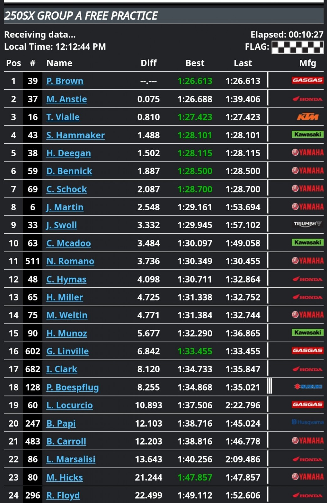 | 1 | Pierce Brown | -- | 1:37.427 | Sandy, UT | GasGas MC 250F | |