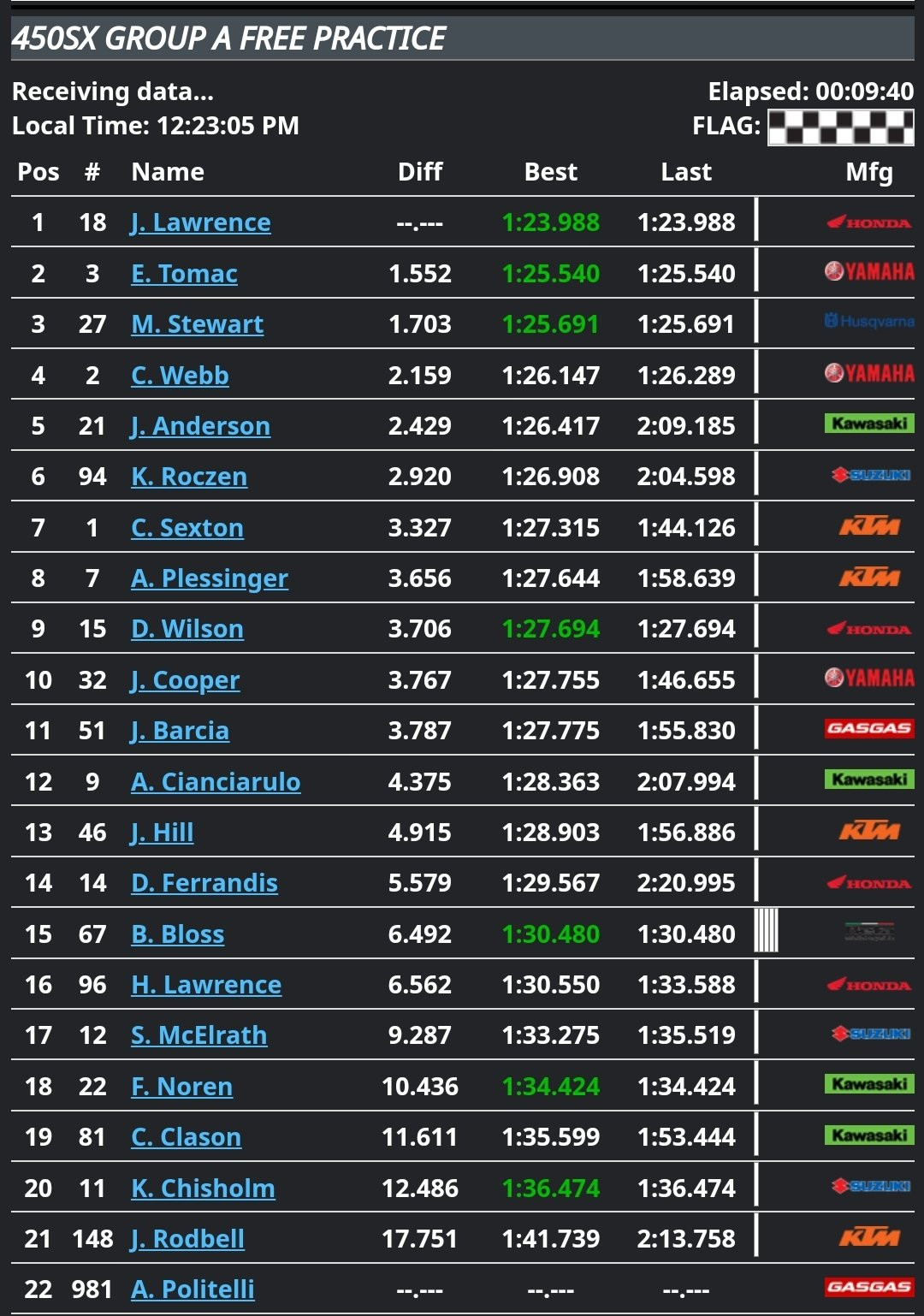 When the 450SX group A field took to the track, it was Justin Barcia and Dylan Ferrandis were leading the field off the starting straight. As they took the green flag, Eli Tomac jumped to the front of the field, leading the group both physically on track and on the live timing link. Jett Lawrence put in a blazing 1:23.988, which topped the session over Tomac’s best of 1:25.540 by 1.552 seconds!