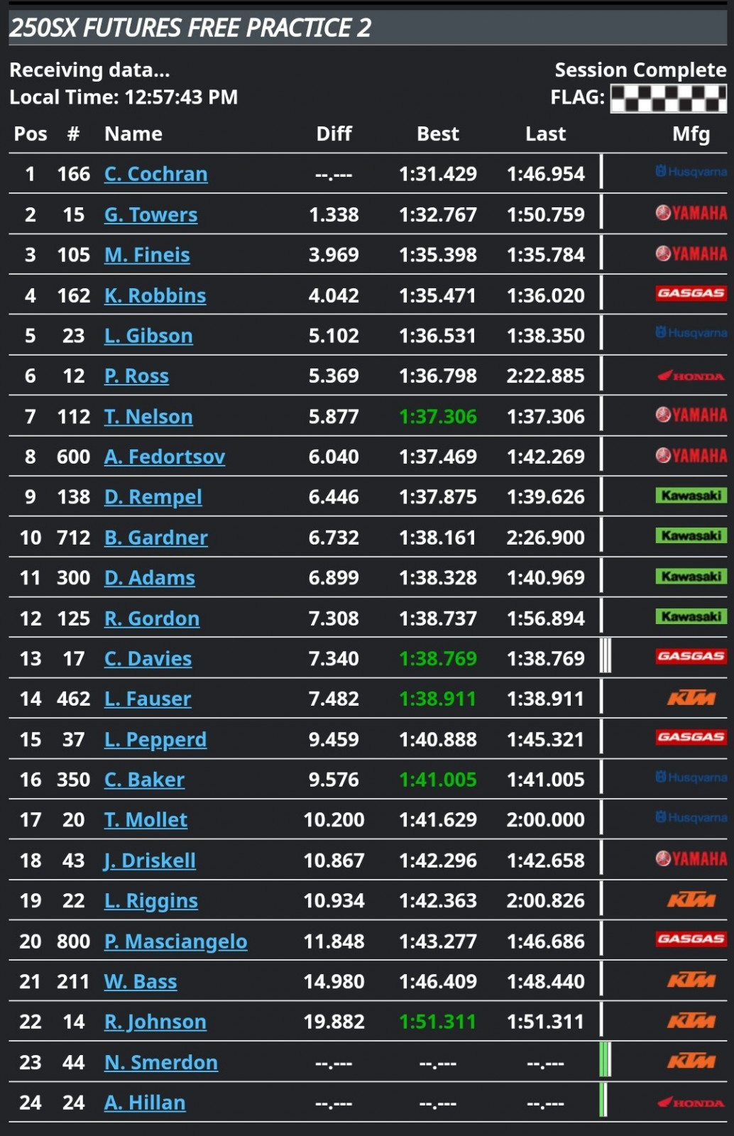 | 2 | Kyle Chisholm | +0.136 | 1:37.510 | Clearwater, FL | Suzuki RM-Z450 | |