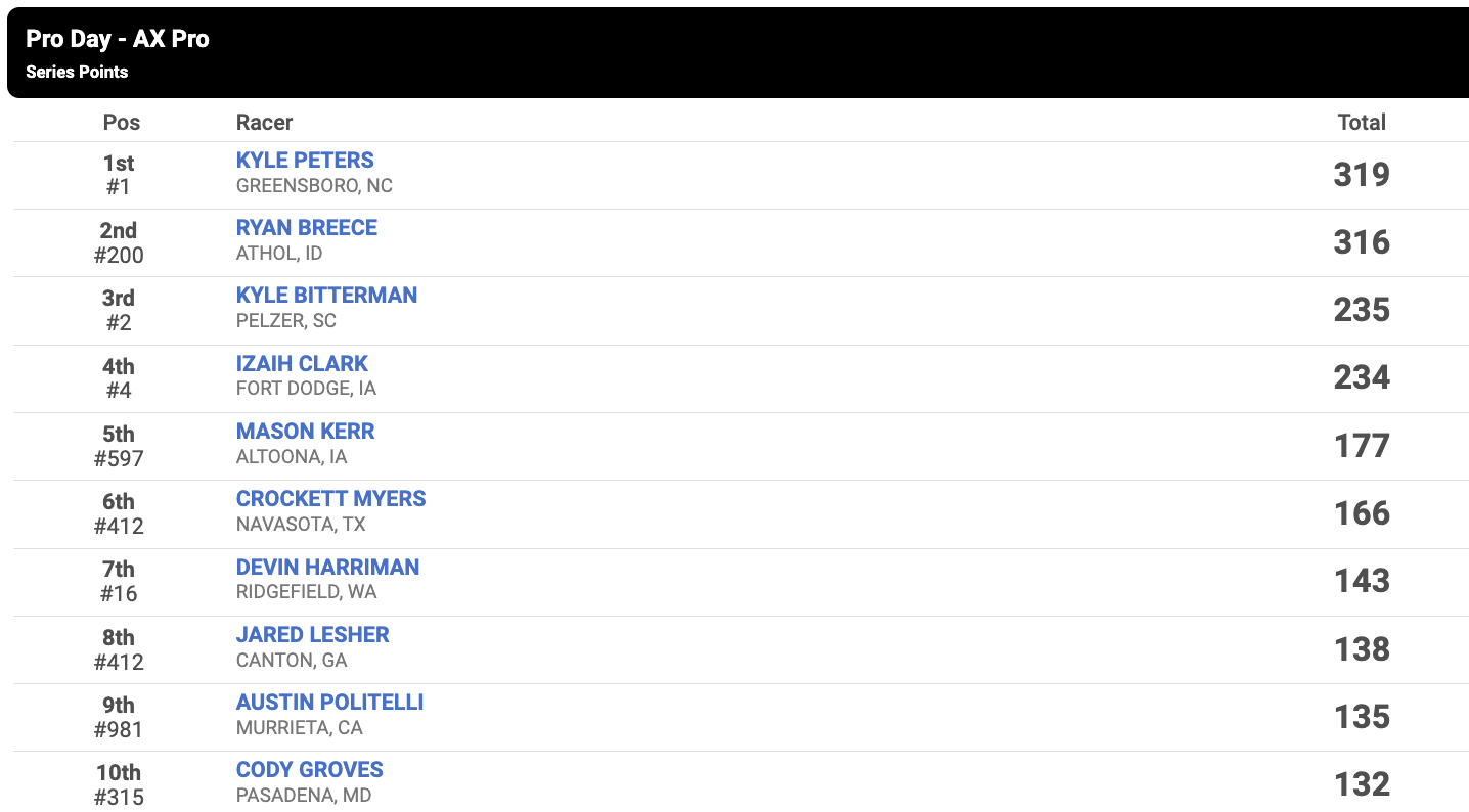 | 2 | Cooper Webb | Newport, NC | 336 |