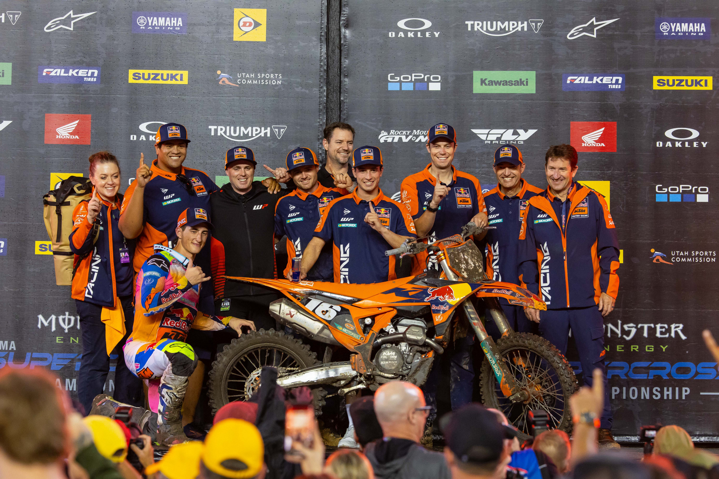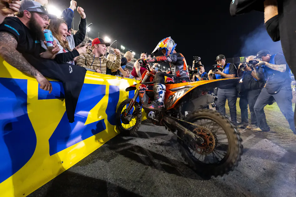 Add Tom Vialle to the record books as a winner in Monster Energy AMA Supercross, as the French Red Bull KTM rider rolled to a commanding win at Daytona on Saturday night. Vialle mentioned early in the evening that the rainy and sandy conditions felt familiar to his days training in Europe, and that experience certainly showed.