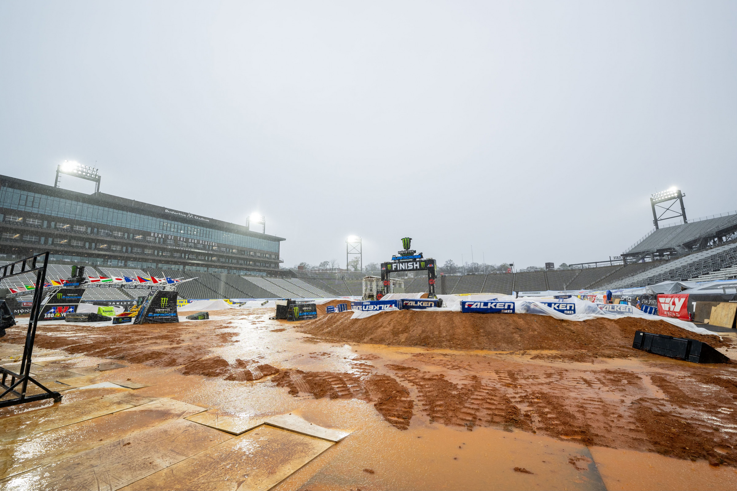 First-ever SX visit in Birmingham this weekend and it's going to be a wet one. Well, it may not rain on Saturday but there was plenty of rain today and the Dirt Wurx guys had a trying week of building the track as well. I'd look for a modified race schedule as well to try and save the track the best they can and also, there's been modifications made to make it a bit tamer because of how soft and rutty it will be. And also, if it rains.