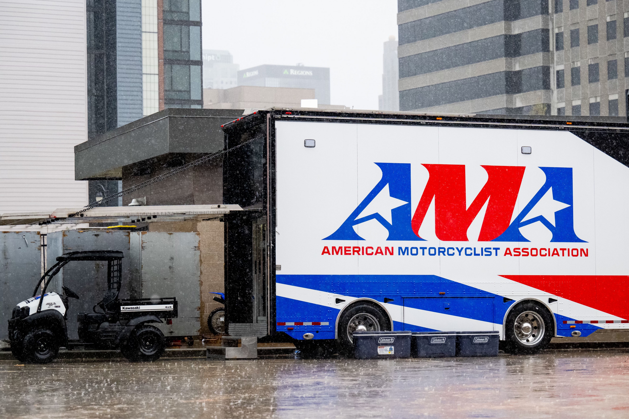 He said the normal fire drill of a wheel-change took longer than usual because it’s harder to remove that tire cover when it’s covered in slimy mud. Christian said the muddiest part of the Daytona facility was the dirt right behind the gate, so that’s what they were trying to protect the tire from. Next time, they will just skip the wheel cover part and just carry the bike over to the starting grates.