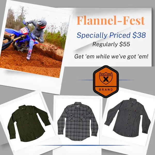 But something changed two weeks ago. On one cold morning in South Carolina, our social media man Matt Rice went for a rip on a Yamaha YZ450FX. He was wearing one of our Racer X flannels. Matt shredded a berm and Mitch Kendra caught it on camera, and, behold, the greatest photo in Racer X brand history. This might as well have been Simon Cudby catching Eli Tomac in full Beast Mode! But with a flannel!