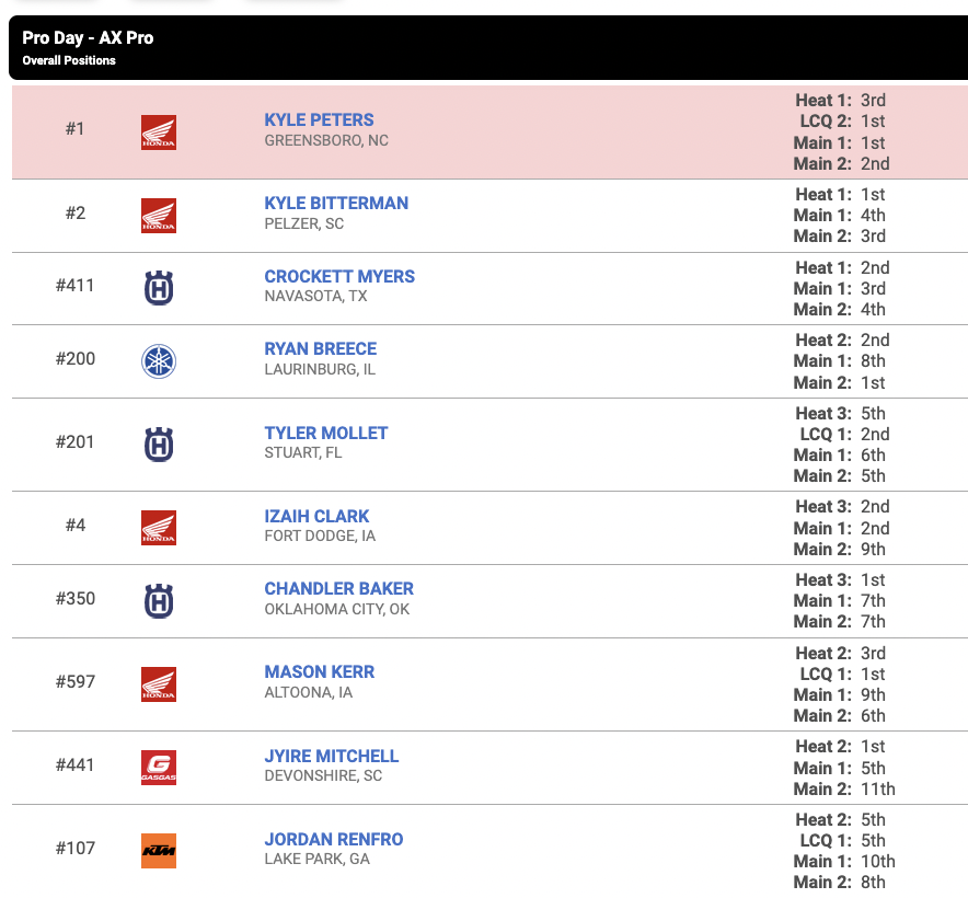 | 10 | Chance Hymas | +44.055 | 54.124 | Pocatello, ID | Honda CRF250R |