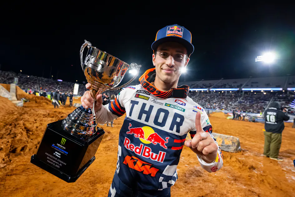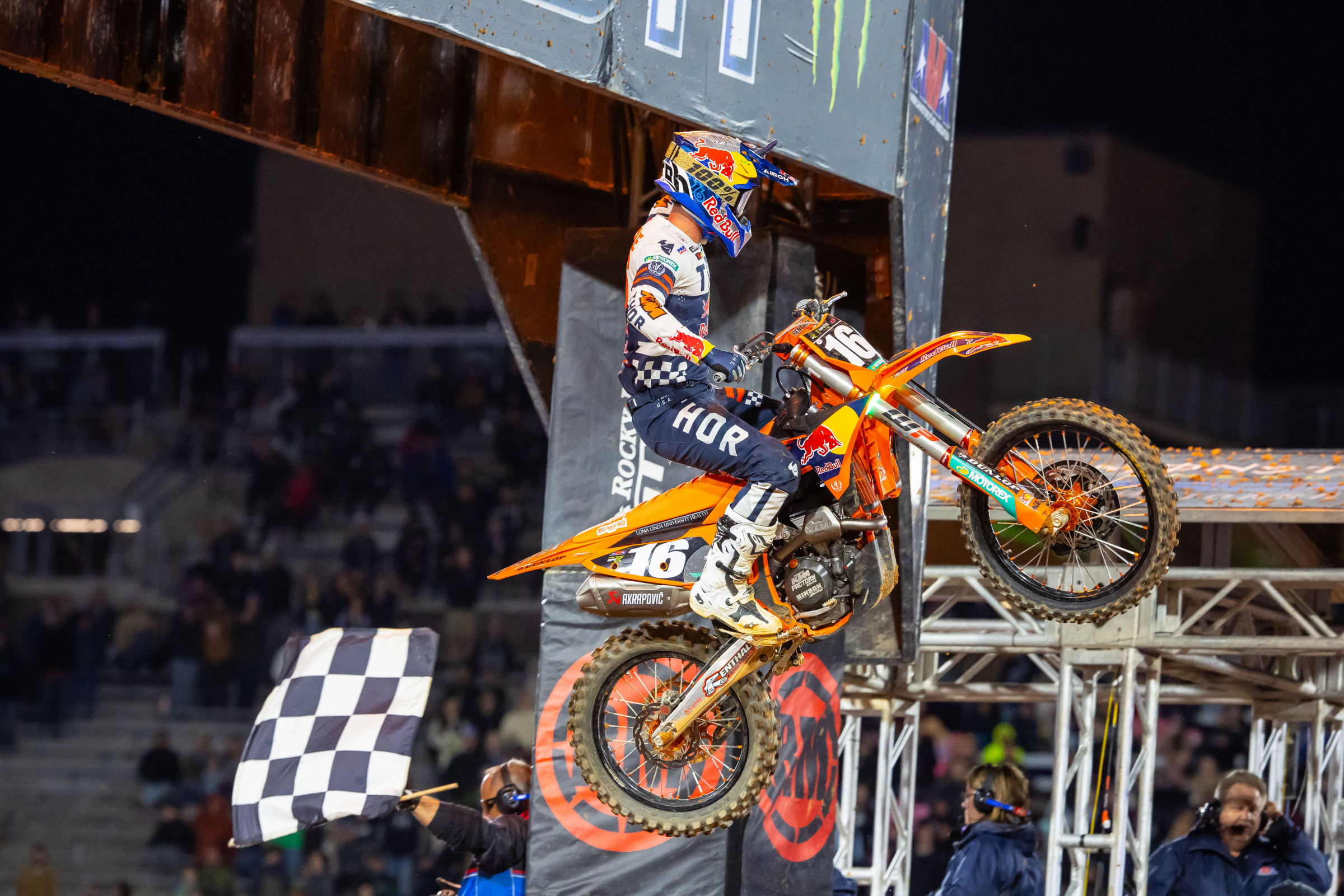 “I mean, the first supercross [win] is always nice, but I mean, Daytona is kind of a different supercross track. It's a little bit like kind of outdoor style,” he said in the post-race press conference. “And I really wanted to win on let's say, a normal supercross track and today was back in the stadium. The track, even if it was a little bit wet in the afternoon, by the night the track was pretty great, and I felt great. I actually won my first ever heat race and then I grabbed the win [in the main] after I had a great start, just lead every lap. The last few weeks, I feel better on the bike, and I actually had a great winter.”