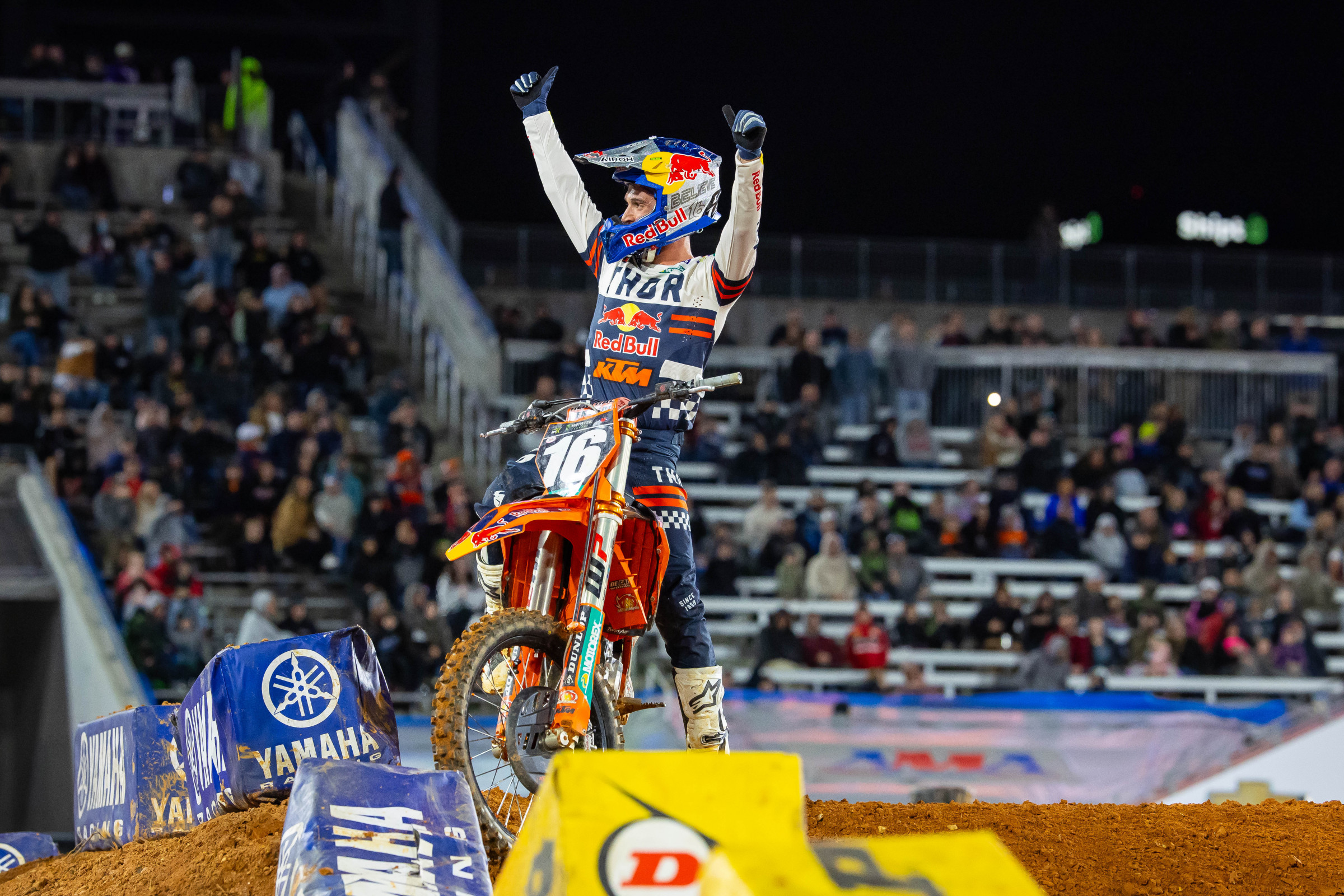 The signature Daytona-style burnout against the fence line was cool, but nothing else about Tom Vialle’s night in Daytona indicated how big his victory actually was. When a rider from the FIM Motocross World Championship (MXGP) moves to the U.S., supercross success becomes the question, and while Vialle was okay last year, he was never really in the fight for wins. Could he get there? This year he has delivered, and fast. Yes, Daytona is the most motocross-like of supercross races, but many riders will tell themselves whatever it takes to build confidence and find the positives. This could have been a huge sigh of relief. A massive moment to exhale and say he’s gotten the job done in supercross.