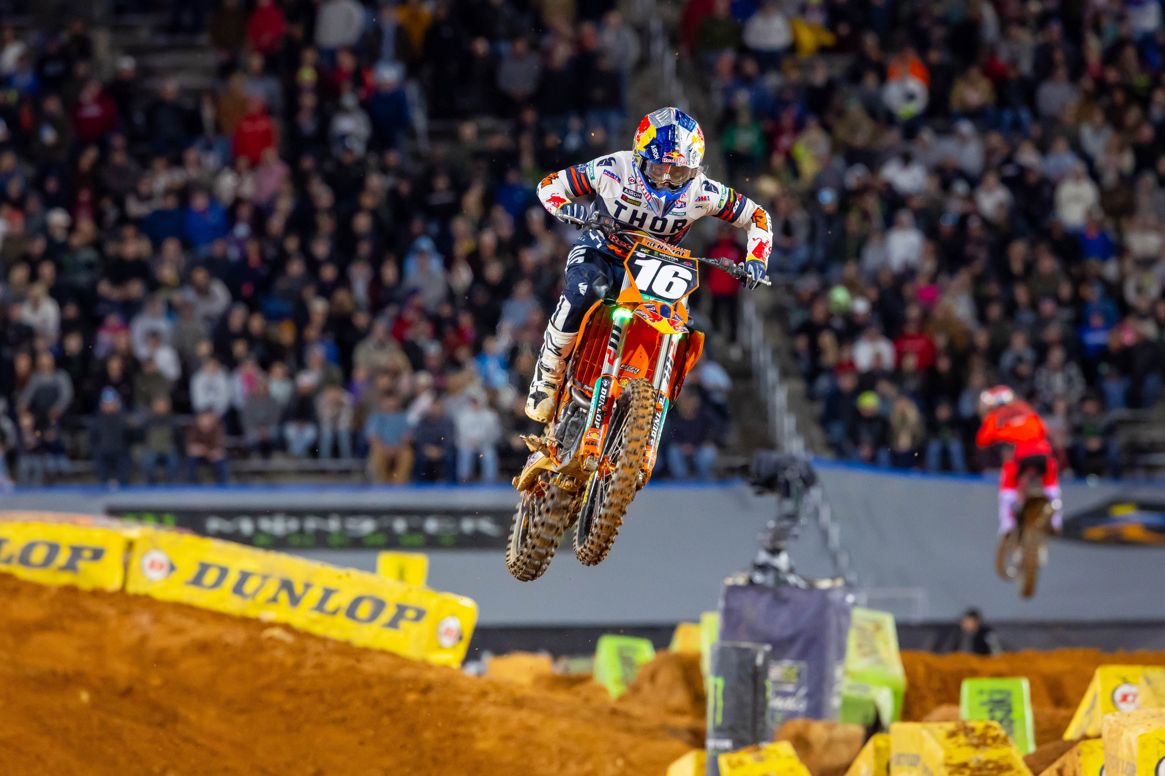 “Supercross, the bike is a little bit different with the gearing and suspension,” he says. “And I think we also way more close to each other, the, the starts are shorter, and everything is more tight, I would say. So, it's pretty different than an outdoor start. But today I had great start in my heat race and in main event actually, I didn't really start great, but the guys didn't brake, and I could cut in the middle of them, and it was actually pretty good. I was first out of the first of the first corner. So, yeah, I mean, the start is especially in supercross is pretty important.”