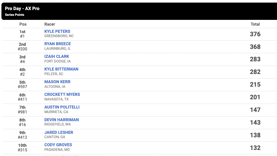 | 2 | Cooper Webb | Newport, NC | 336 |