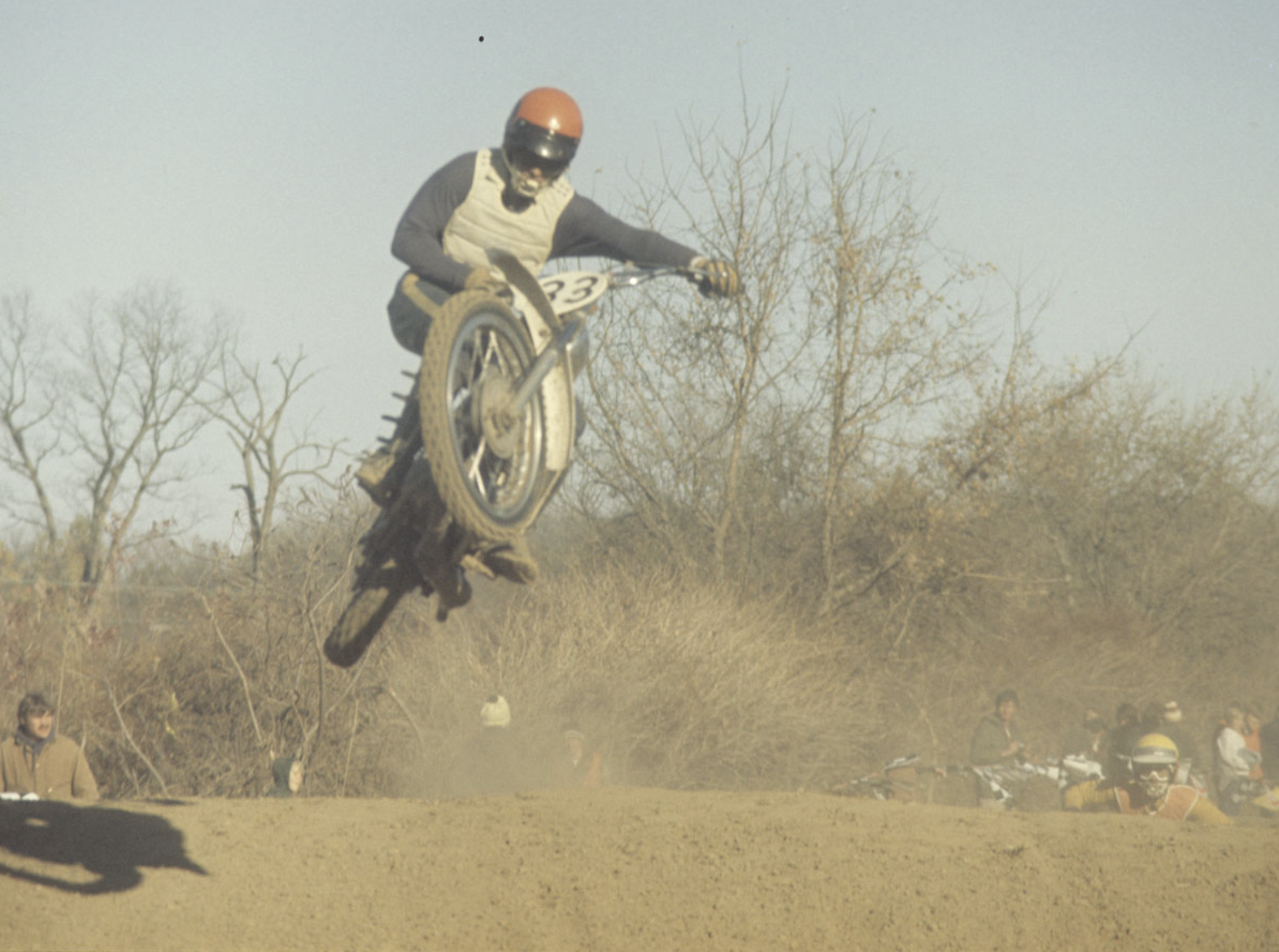 This photo is of Semics in 1971 Trans-AMA at St. Peters, Missouri, shot by my dad Wally. At this time Gary was 17 and the AMA rules were that you had to be 18 to be eligible to race the Trans-AMA Series, so Gary entered using the name of his neighbor Dale Burton. And if you see race programs from that series it says #33 Dale Burton from Lisbon, Ohio!