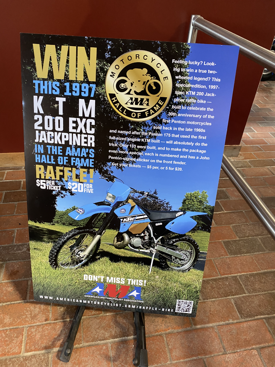 Upon entering the AMA Motorcycle Hall of Fame, the first thing you will probably notice is the blue "Penton" motorcycle sitting in the lobby. The bike is actually a 1997 KTM 200 EXC modeled as a Jackpiner-edition Penton from yesteryear (as in the years that KTMs sold in America were actually Pentons, named after John Penton, and in case you're wondering, the Jack Pine Enduro in Michigan was once one of the biggest and most prestigious off-road events in America). From time-to-time supporters of the AMA Motorcycle Hall of Fame will donate motorcycles to be sold or raffled off, with the funds going to support the museum and the AMA HOF. Besides the Jackpiner, there are two other bikes up for grabs—a 2024 Kawasaki Ninja ZX-4RR 40th Anniversary Edition and a 1975 BMW R90S.