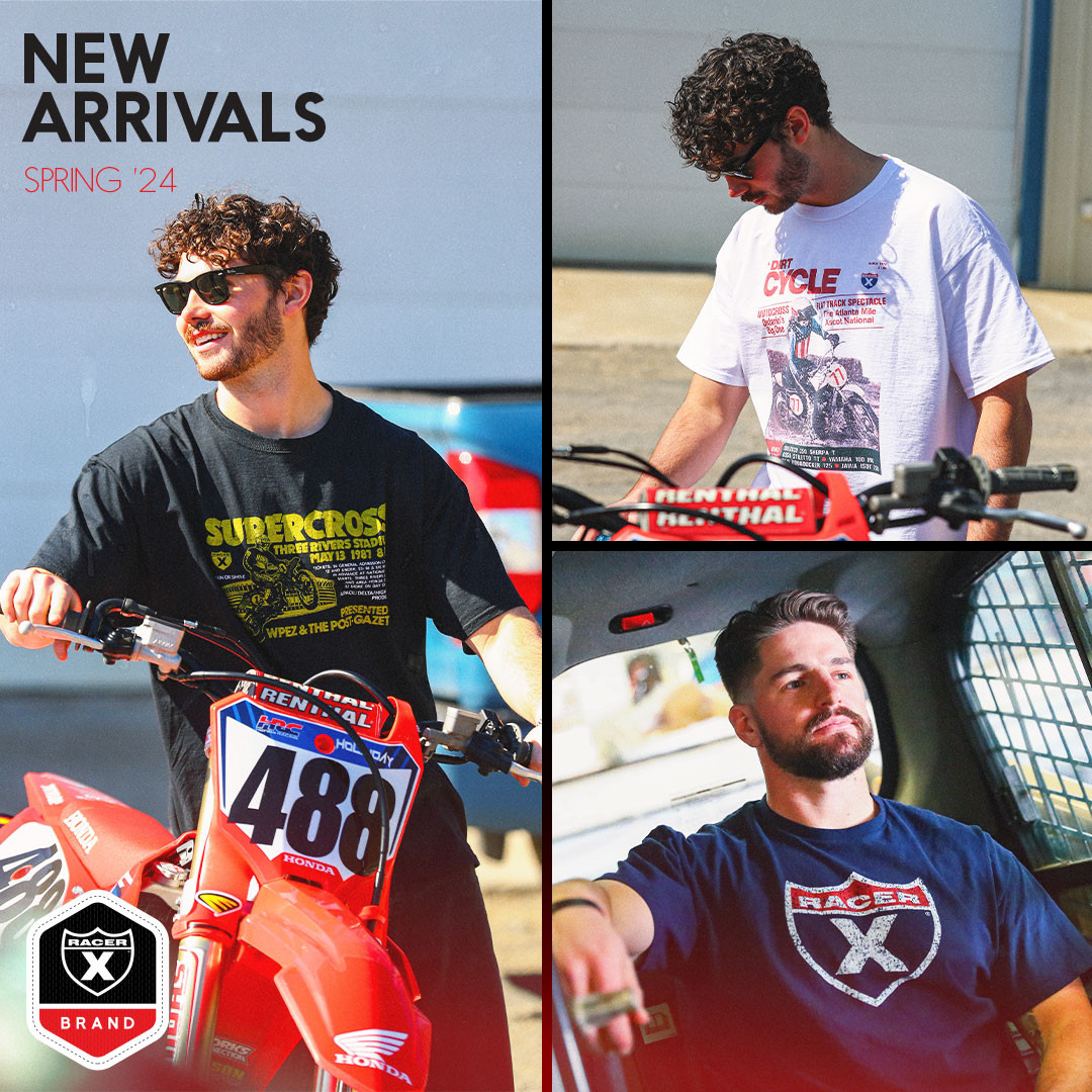 The Racer X Brand Spring 2024 release is here! Take a look at the latest line that features three T-shirts: the Navy distressed shield, dirt cycle, and three rivers SX.