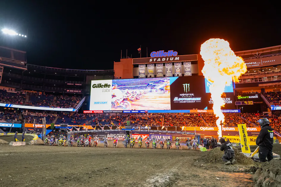 Cooper Webb has got that dog in him, and that dog is hungry. He spent the two-week break between rounds of Monster Energy AMA Supercross working on speed, and it showed immediately in Foxborough, Massachusetts, when he pushed to the fast qualifying time for the day, a rare feat for a rider not known for one-lap qualifying pace. Webb wanted and needed this one, though, sitting eight points behind series’ leader Jett Lawrence. The two then went at in their heat race, with Jett making a late pass to snag a close win. In the main, though, Lawrence spun after the starting gate and found himself buried in the pack, while Webb snagged the holeshot.
