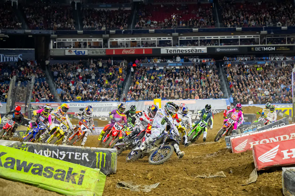 Nashville has become the kind of town where you enter with high hopes and plans for an electric night, but wake up the next morning feeling quite rough and wishing you could have that one back. Definitely unforgettable, though. That's unfortunately the case again for Monster Energy AMA Supercross in Nashville this year, as a night filled with more wild and unfortunate crashes dotted the evening. This was headlined in the much-anticipated 250 East/West Showdown, where Monster Energy/Pro Circuit Kawasaki was making a championship comeback of sorts after years of heartbreak. Instead, the luckless team found an even more heartbreaking way to hand over the red plates, with Cameron McAdoo crashing into teammate Levi Kitchen in the second turn of the race. McAdoo was already hurting after a crash in practice which left him with a bad shoulder. That main event crash pretty much did him in, and he tried to log laps but eventually had to pull off. Kitchen got up slowly, and in last place, but valiantly fought back for 14th. But he, too, might be injured and headed to the hospital for checks.