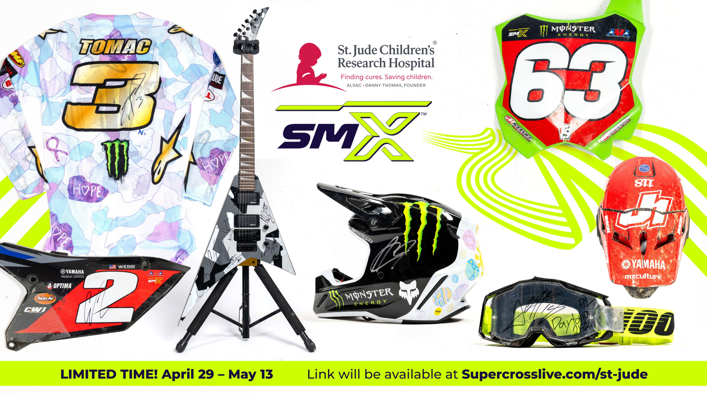 As of Monday, April 29 at 9 a.m. Eastern, the annual Love Moto Stop Cancer Supercross auction is now live, benefitting St. Jude Children's Research Hospital. Race-worn jerseys, pants, helmets, goggles, and bike plastics from the sports top racers are donated to the online auction in an effort to raise money for the fight against childhood cancer. Fans can find the link to bid at supercrosslive.com/st-jude.