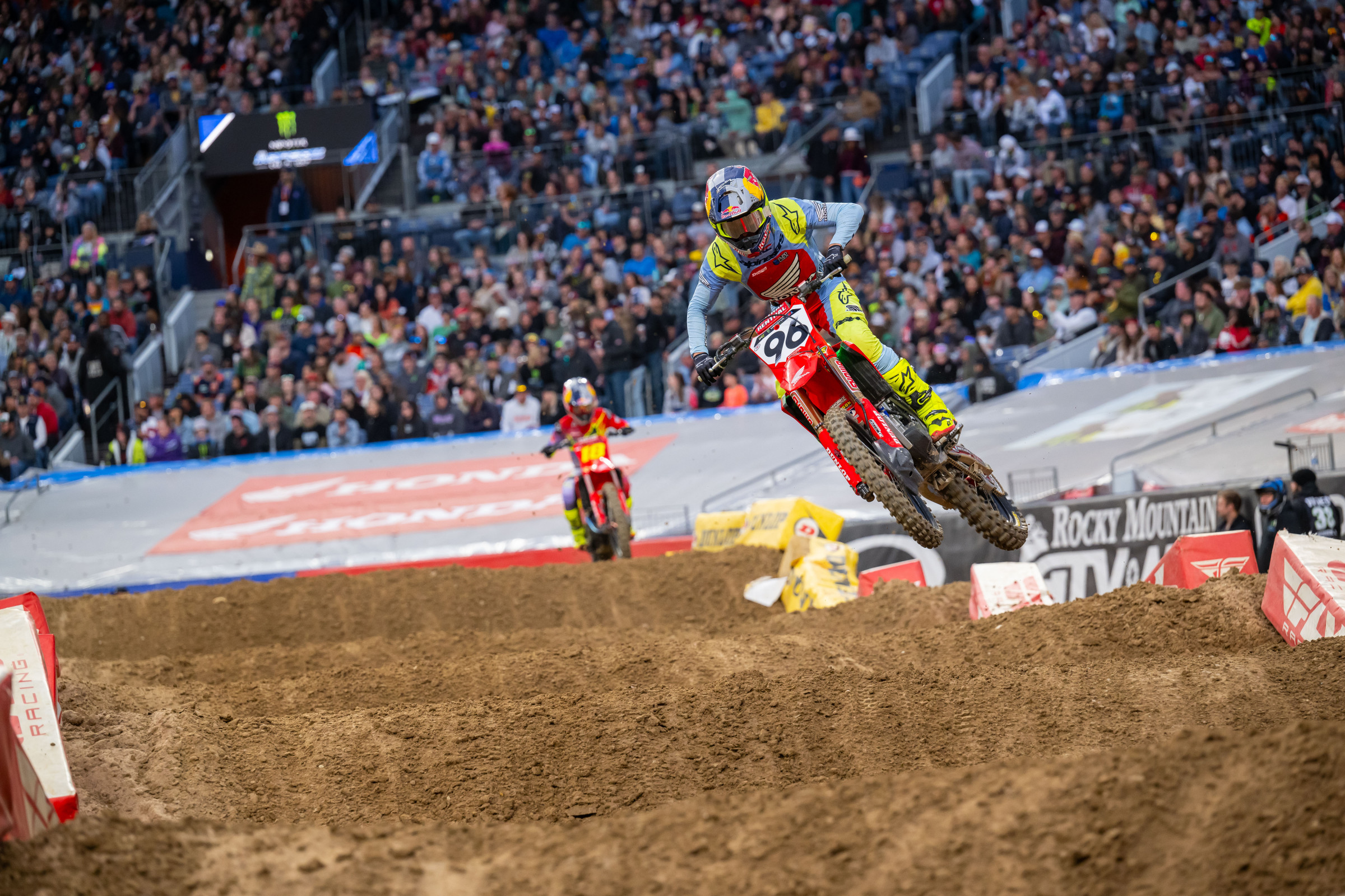 Hell, by the next weekend, the #96 machine came through tenth in the main event in San Francisco. From then, it was on. The highs and the lows both came. The highs—top seven finishes and top five finishes were checked off. The lows: a hard crash at the Daytona SX that left him with a busted-up shoulder blade. He returned after missing only the Birmingham SX and got back into the mix. Even with the injury lingering and still hindering him a little, he continued to progress and kept building—and checking more boxes. Through it all, more highs came. Heat race win(s): check. Fastest qualifier: check. First career podium: check (at the St. Louis SX with some help, but still). Then, after three straight seventh-place finishes, the #96 put together his best ride of the season in Colorado.