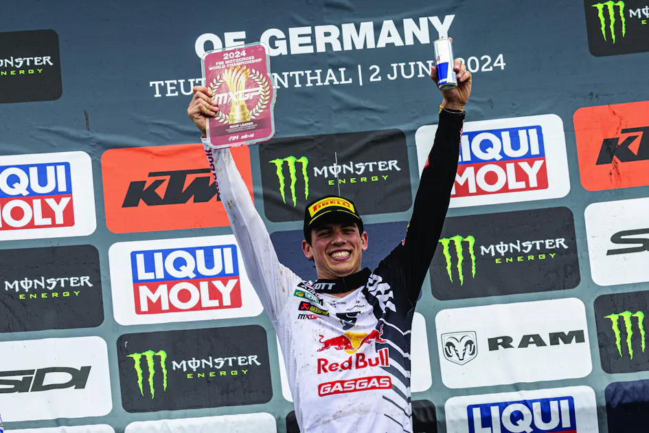 After struggling more than most in muddy conditions so far this season, reigning World Champion Jorge Prado took his sixth Grand Prix win of the season in MXGP, with two race wins for Red Bull GASGAS Factory Racing, achieved in his customary style of getting out early and holding off all challengers, although he certainly had challenges to contend with! He leaves Germany with the red plate back on his machine, and a slender two-point lead in his pocket heading to Latvia.
