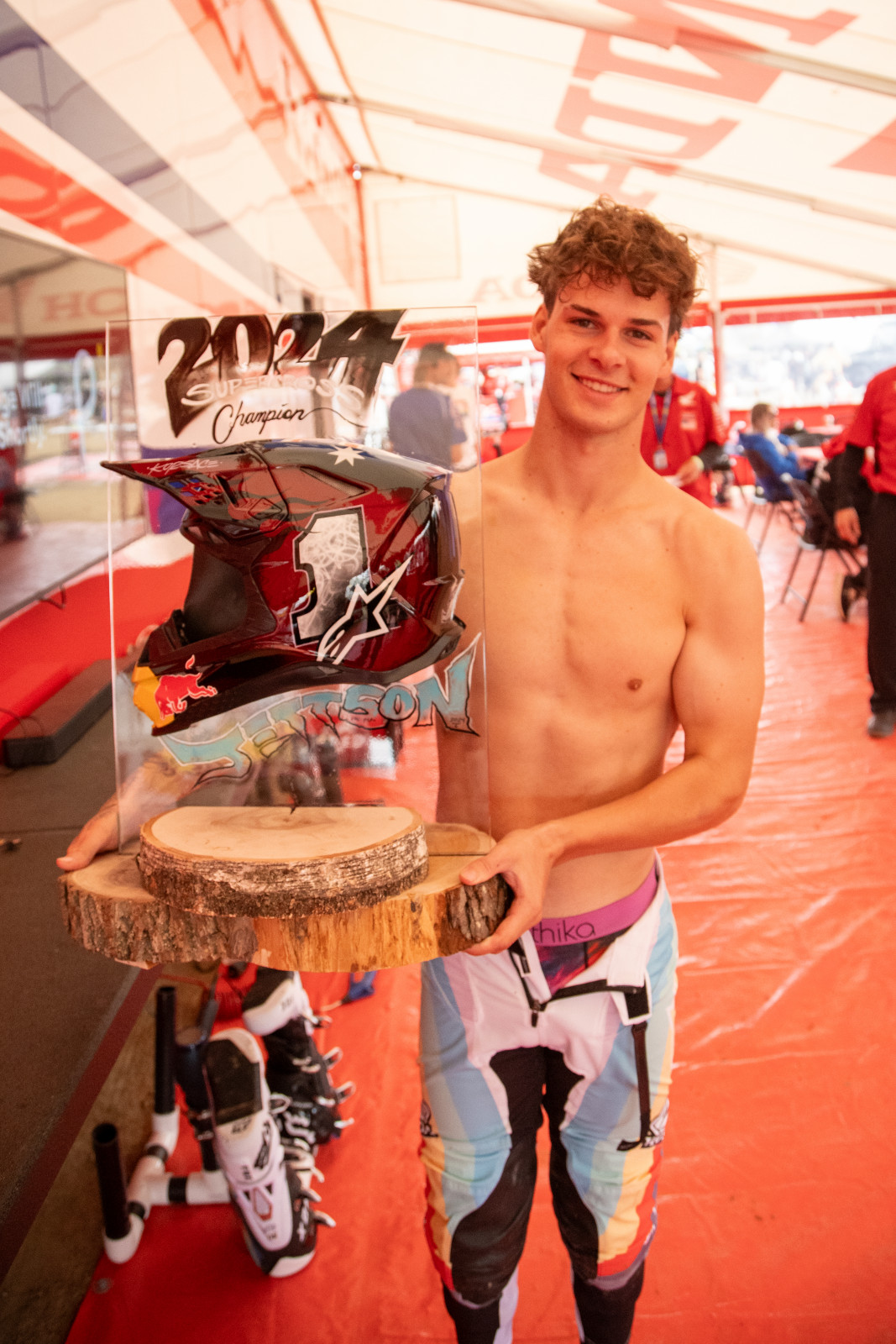 Kordel was on a mission to deliver this trophy when he flagged me down as I wandered the pits, looking for fan and rider interactions. My media vest and camera slung around my shoulder made me an easy target for what Kordel was after: a photo of his impressive trophy he designed and made, dedicated to Jett for his 2024 Supercross Championship. Kordel wanted to highlight this accomplishment in his own way, because in the weeks that the riders had transitioned their training from Supercross to focus on the Nationals, Kordel had been putting in work of his own: “The idea just came to me in my head,” Kordel said. Happy to snap a couple photos for him, he suggested we head toward the Honda tent to meet with Christian Kapoukranidis, an employee at Alpinestars who helped coordinate with Kordel to drop off the trophy for Jett.