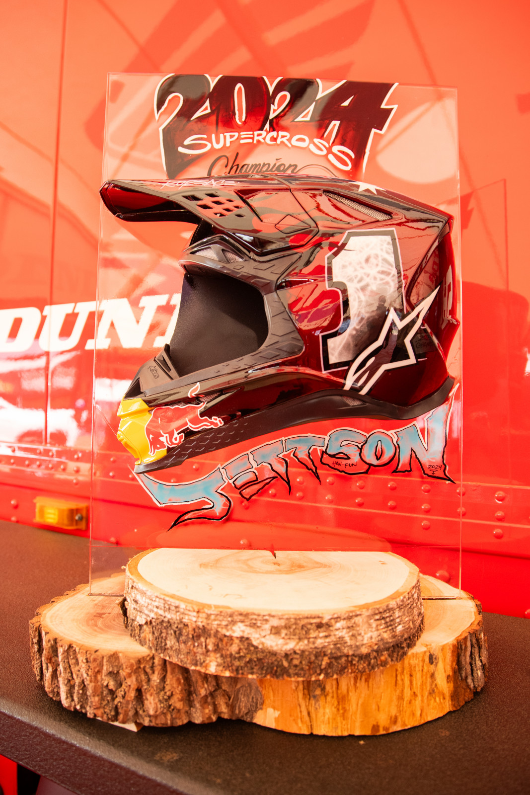 The trophy that Kordel designed took many hours to make and features woodworking, meticulous glass painting, and half of a full-sized Alpinestars helmet set into the glass. This blending of different art styles and techniques really highlights what a good trophy can be. As a helmet artist, Kordel featured his own passion and skill set in the trophy with the fully custom, hand-painted helmet being the main feature of the design. Small details throughout the piece include Jett’s finishing position of each race on the backside and a handcrafted wooden base, completed with the help of a family member. So on the first race of the Pro Motocross season, he drove the trophy to the track and carried the heavy work of art into the pits, looking to gift the trophy to Jett. Kordel was able to share his creation with people equally as passionate about the sport.