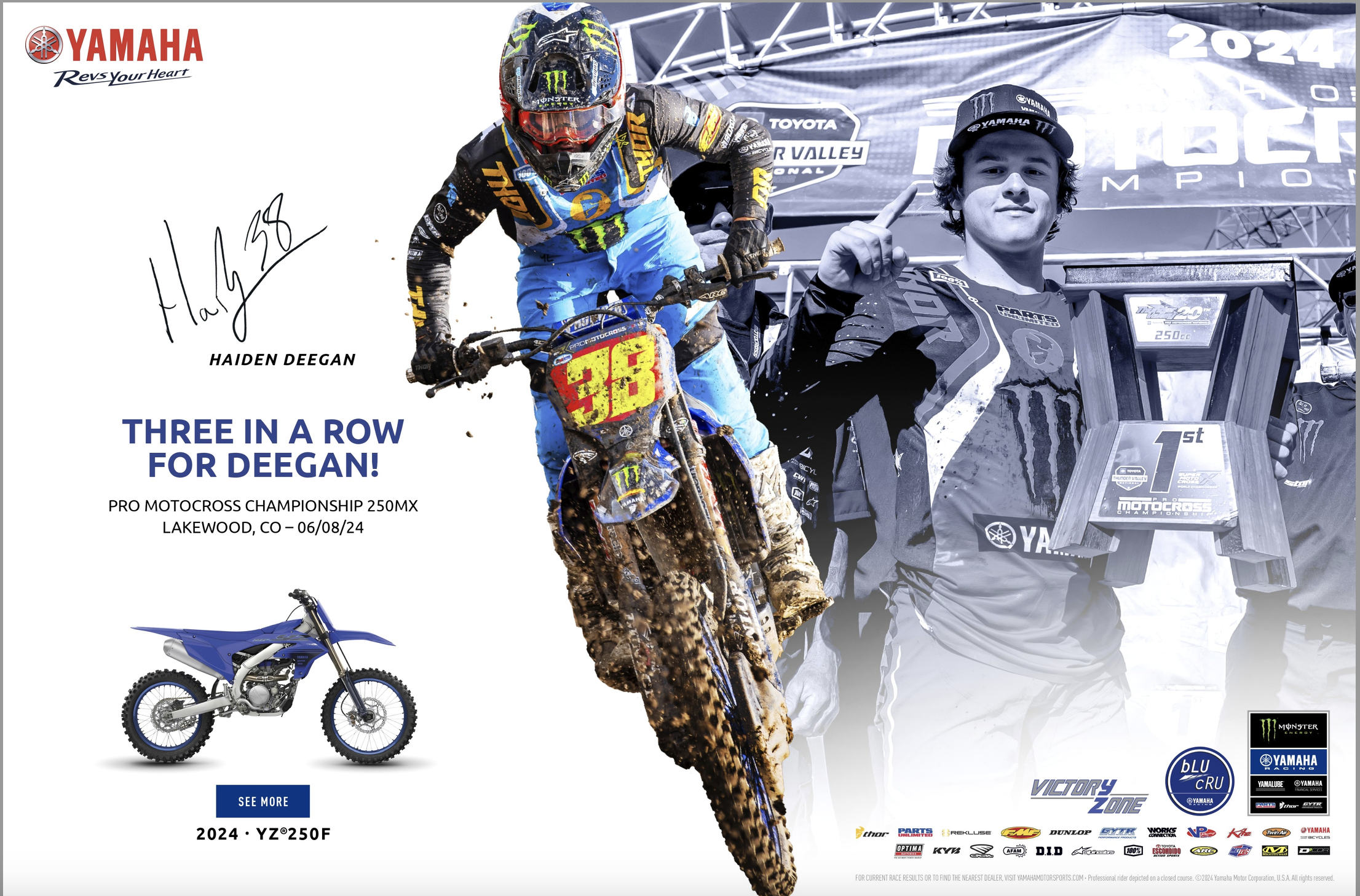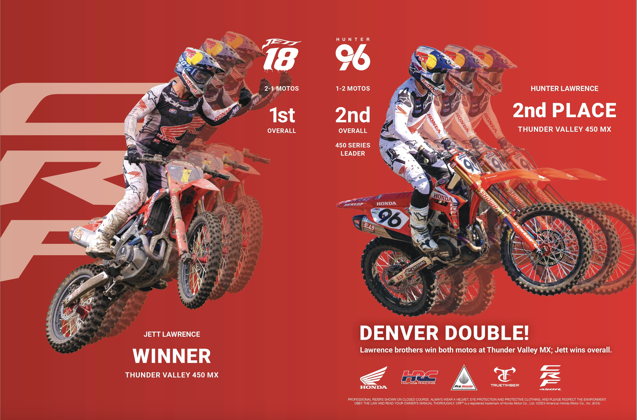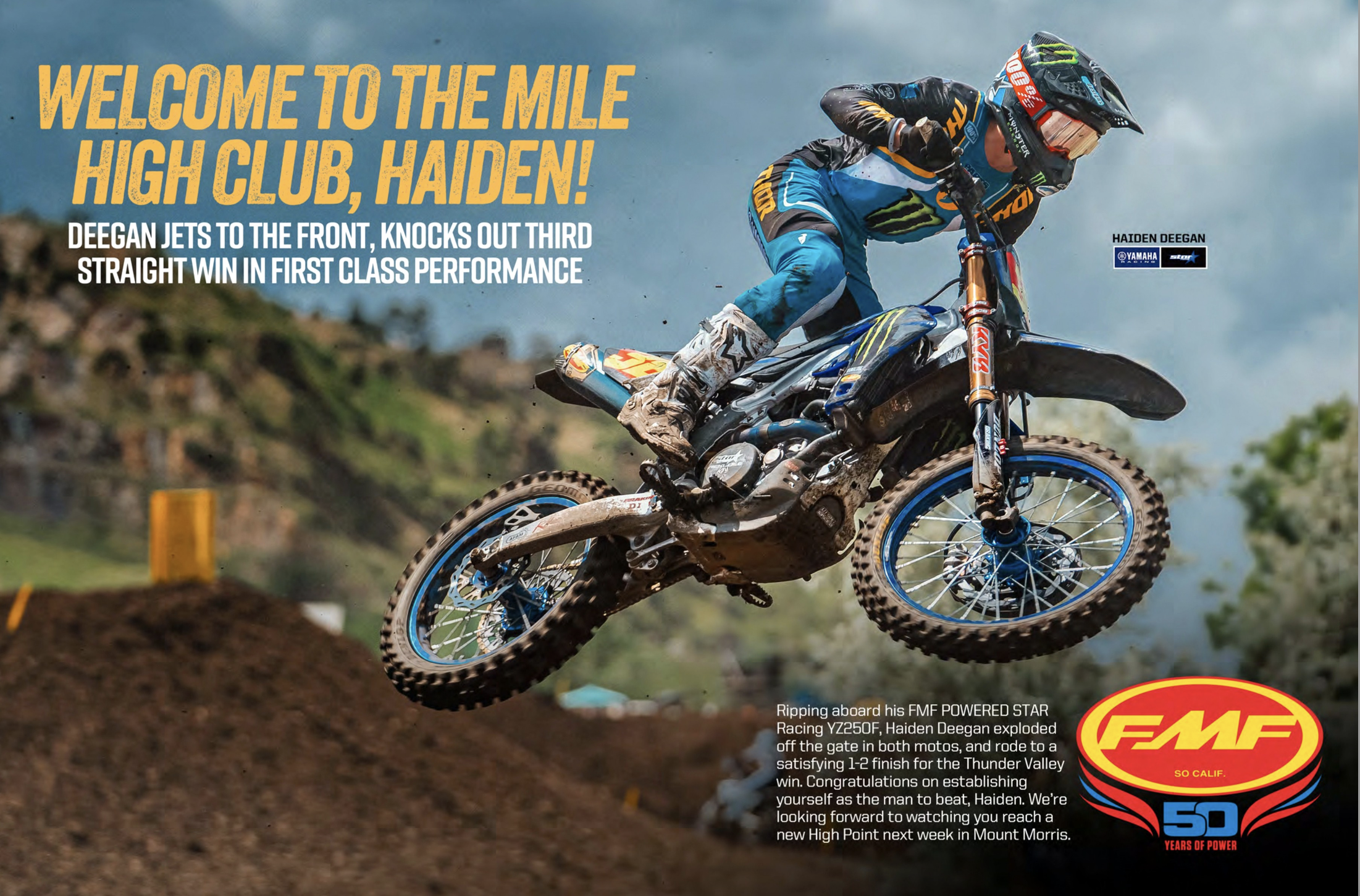 Earlier this week we were thumbing, er, scrolling through this week's Cycle News to check out the most recent race reports, as well as the latest batch of win ads. With Haiden Deegan winning for the third straight week Yamaha might be running out of creative headlines for their ads, but we've got to give it up for FMF, which ran a clever, "Welcome to the Mile High Club, Haiden," atop their celebratory ad. Honda posted on another 1-2 for Jett and Hunter, and they too must be running low on unique headlines for all of Jett's successes.