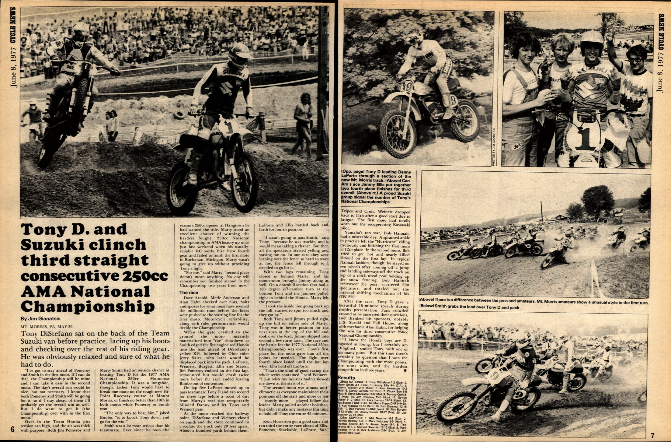 High Point Raceway didn't really look like this when it hosted its first AMA Pro Motocross on May 29, 1977. The Holbert family farm was still much more farm than raceway, but the general layout of the valley track got some good reviews from the men racing there for the first time. The '77 race was a stand-alone 250 National with a 125cc support class. The race marked the last round of the 250 AMA National Championship, and Team Suzuki's Tony DiStefano would not only win the overall with 1-2 finishes to Marty Smith's 3-1 tally, he also claimed his third straight 250 title. Here's the Cycle News coverage of that first race: