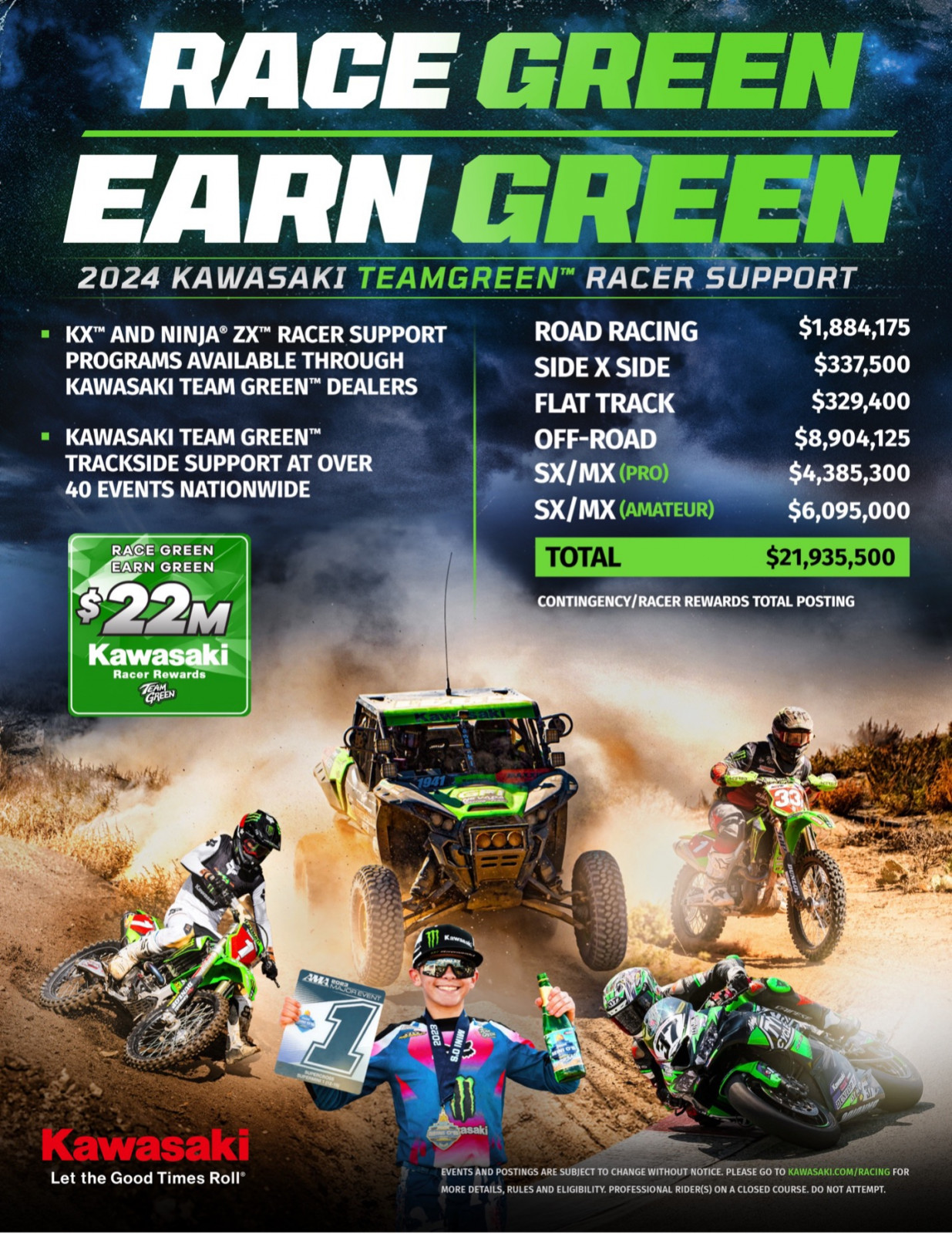 Make sure you register each year for Kawasaki Team Green Racer Rewards (contingency) so you can take advantage of nearly 80 events with payouts up for grabs, for example: