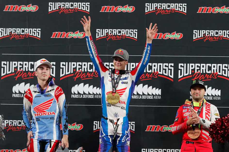 The 2024 Paris Supercross, one of the longest running off-season races for top Monster Energy AMA Supercross competitors is almost here. On November 16 and 17, the Paris La Défense Arena in Paris, France, will host the 41st Paris Supercross as top U.S. competitors Jett and Hunter Lawrence, Cooper Webb, Dylan Ferrandis, and Malcolm Stewart will compete in the SX1 (450cc) Class as the SX2 (250cc) Class will feature, Jo Shimoda, Tom Vialle, and Anthony Bourdon. Jett Lawrence (2023 King of Paris) and Shimoda (2023 Prince of Paris) will both be returning to the 2024 event with #1 plates aboard their respective Honda HRC Progressive machines. For more information on the event, read about the history of the Paris Supercross.