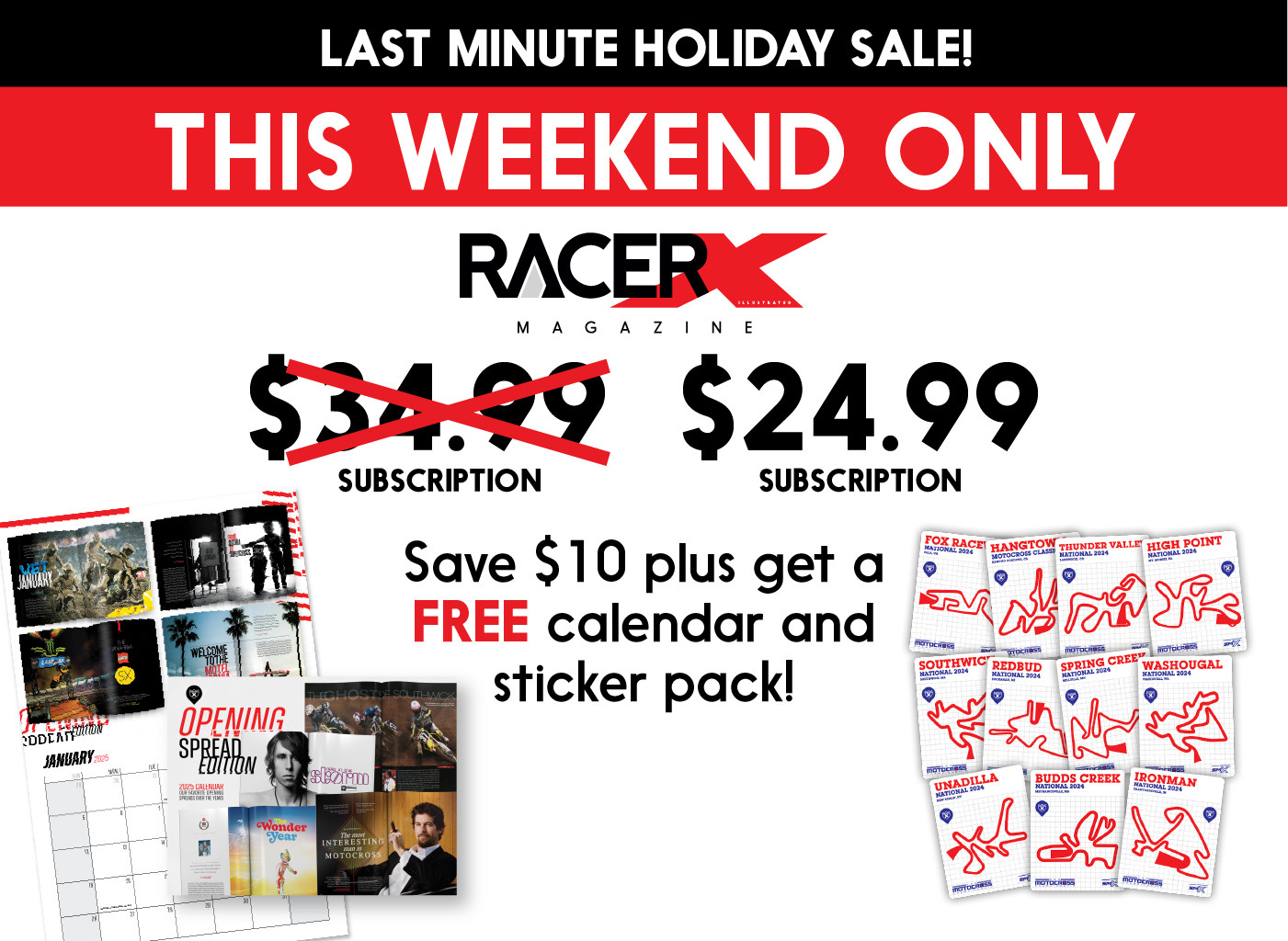 It's our best deal of the year. Subscribe or renew to Racer X magazine this weekend only and save $10, plus get a free 2025 Racer X calendar. From "The Ghosts of Southwick" to "The Wonder Year," join us as we revisit our favorite opening spreads, bringing them to you each month in our exclusive 2025 calendar - only available for a limited time! Add to that our Pro Motocross Sticker Pack featuring the exclusive sticker from each event! This deal is only running from December 20-22. Act fast!