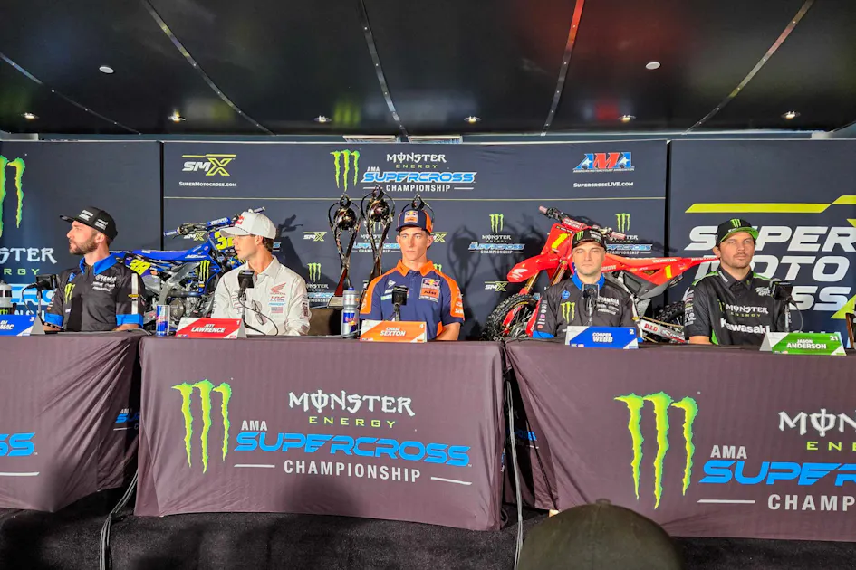 The current contenders all took turns up on the stage, 250 riders first (though an under-the-weather Levi Kitchen was not there today), then the first half of the 450 contenders, then finally the five current or past SX Champions racing tomorrow night: Eli Tomac, Cooper Webb, Jason Anderson, Chase Sexton, and Jett Lawrence.