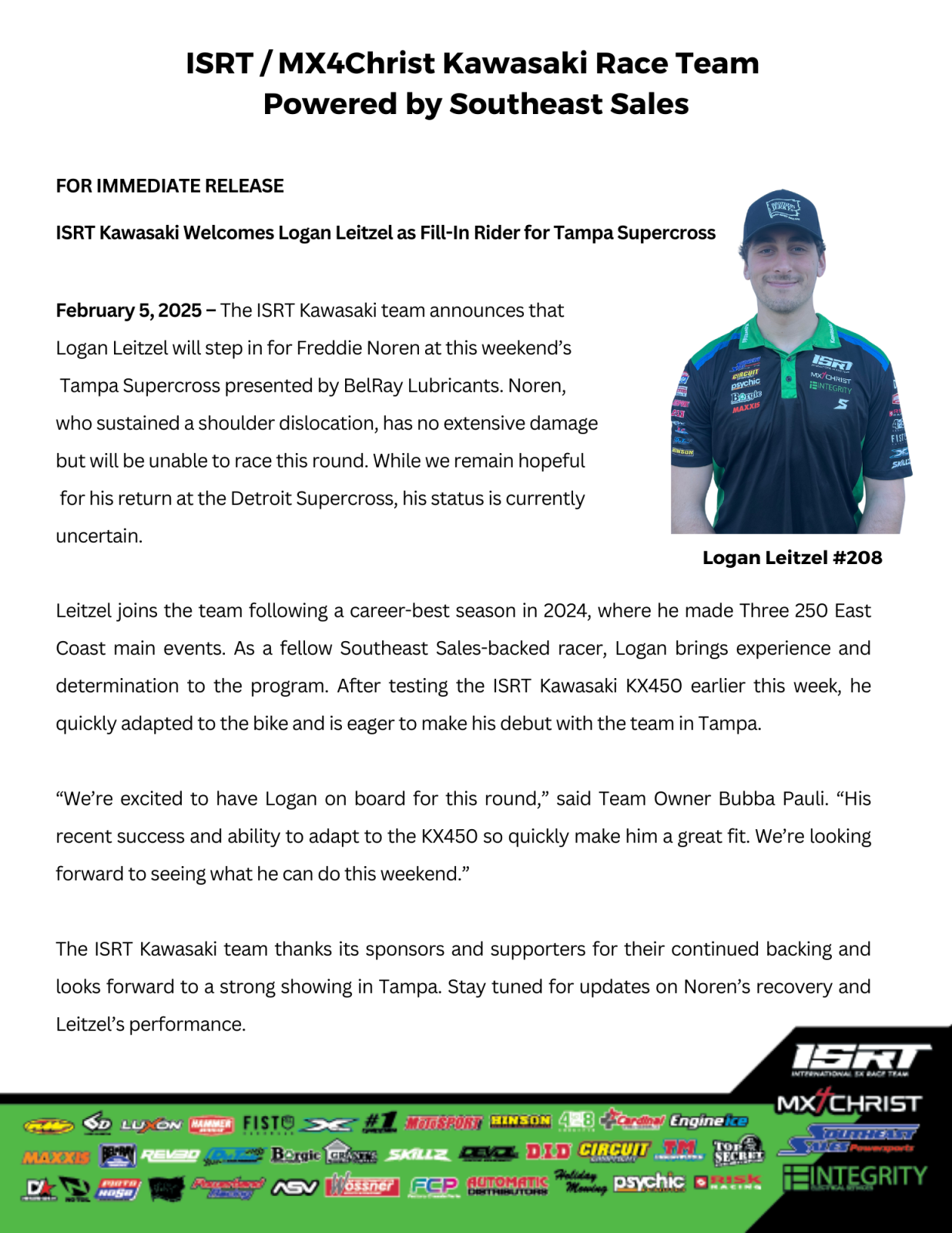 The ISRT Kawasaki team announces that Logan Leitzel will step in for Freddie Noren at this weekend's Tampa Supercross presented by Belay Lubricants. Noren, who sustained a shoulder dislocation, has no extensive damage but will be unable to race this round. While we remain hopeful for his return at the Detroit Supercross, his status is currently uncertain.