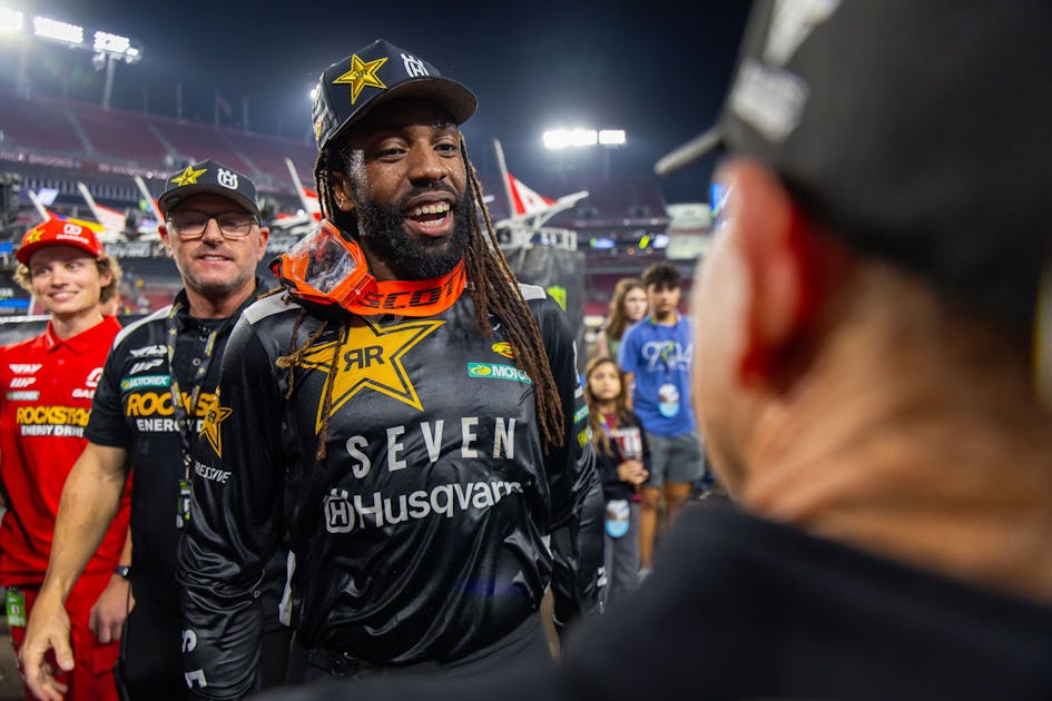 Malcolm Stewart wrote himself into the history books on Saturday with a big night in his home state of Florida. Stewart started inside the top ten and got to work, picking up position after position until he was in a podium spot. Then, he made a pass into second and started to run down championship leader Chase Sexton. When Sexton crashed at the end of the whoops section, Stewart flew by and into the race lead. Still, he had to get to the finish line. And after a handful of laps, he did just that!