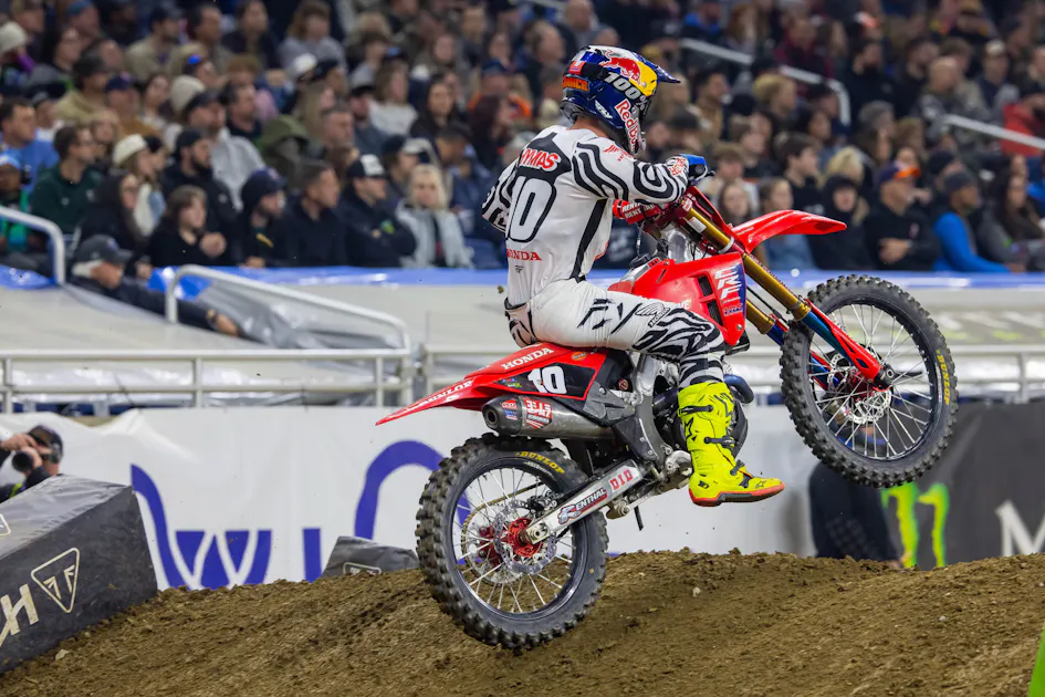 Hymas says he’d only tested the new 2025 Honda chassis for four days before Tampa, and then when he added in Tampa press day, race day and a solid week before Detroit, he’d practically doubled his time learning the bike before round two. What’s wilder, he says, even with only four days under his belt, he still felt more prepared than in his previous supercross seasons!