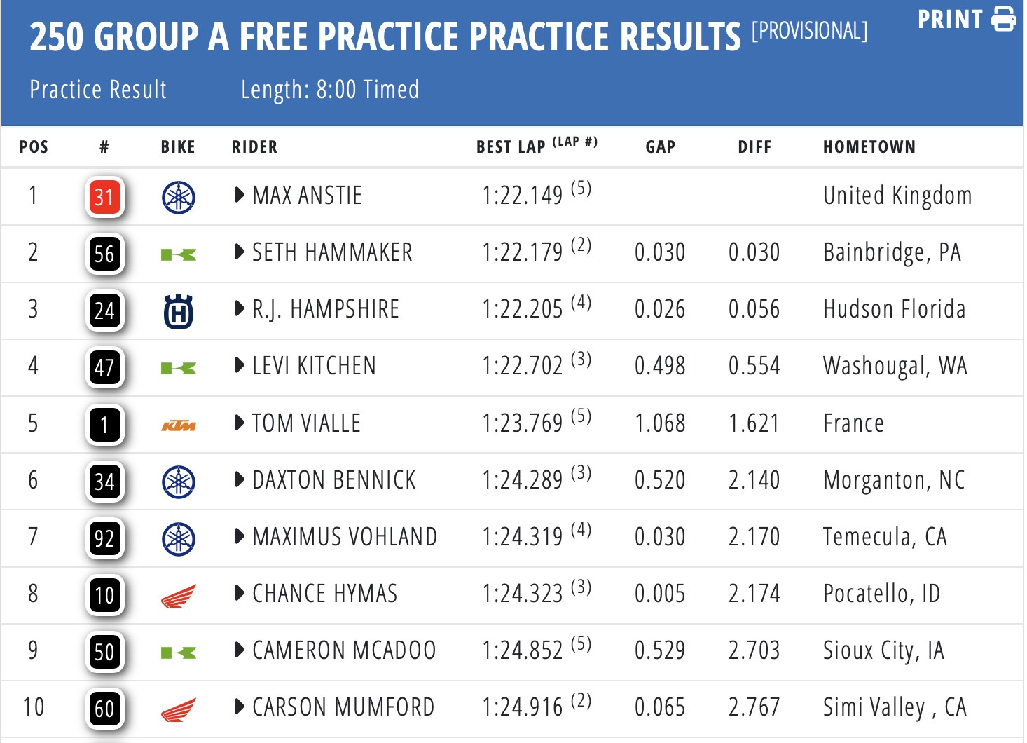 The 250 A group hit the track for free practice this morning with red plate holder, Max Anstie putting in the fastest time with a 1:22.149, Seth Hammaker was close behind with a 1:22.179. Meanwhile in B group Ryder Floyd was fastest while Chase Marquier topped the board in the C group.