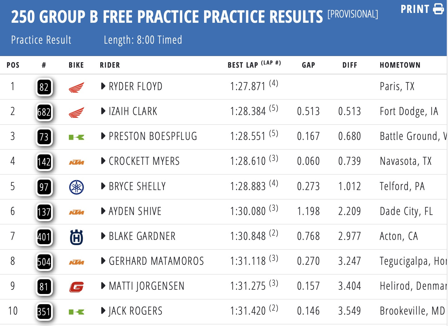 | 5 | Crockett Myers | 1:26.203 | Navasota, TX | KTM |