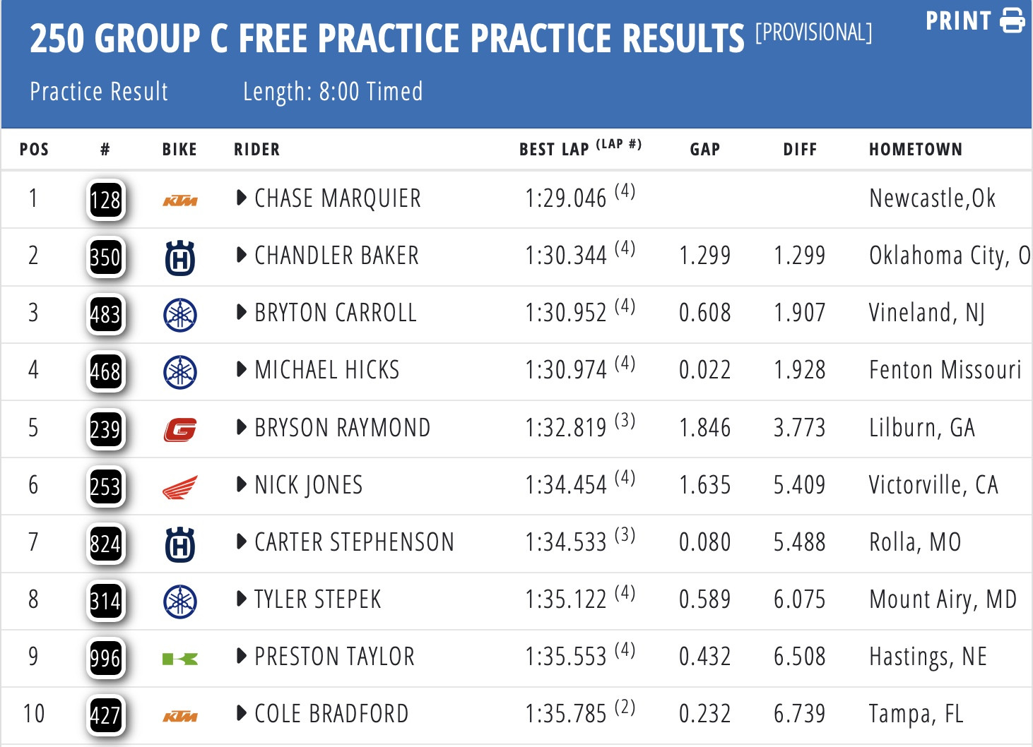 | 4 | Chandler Baker | 1:25.426 | Tulsa, OK | Husqvarna | ||