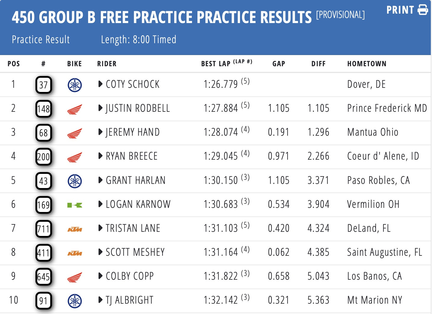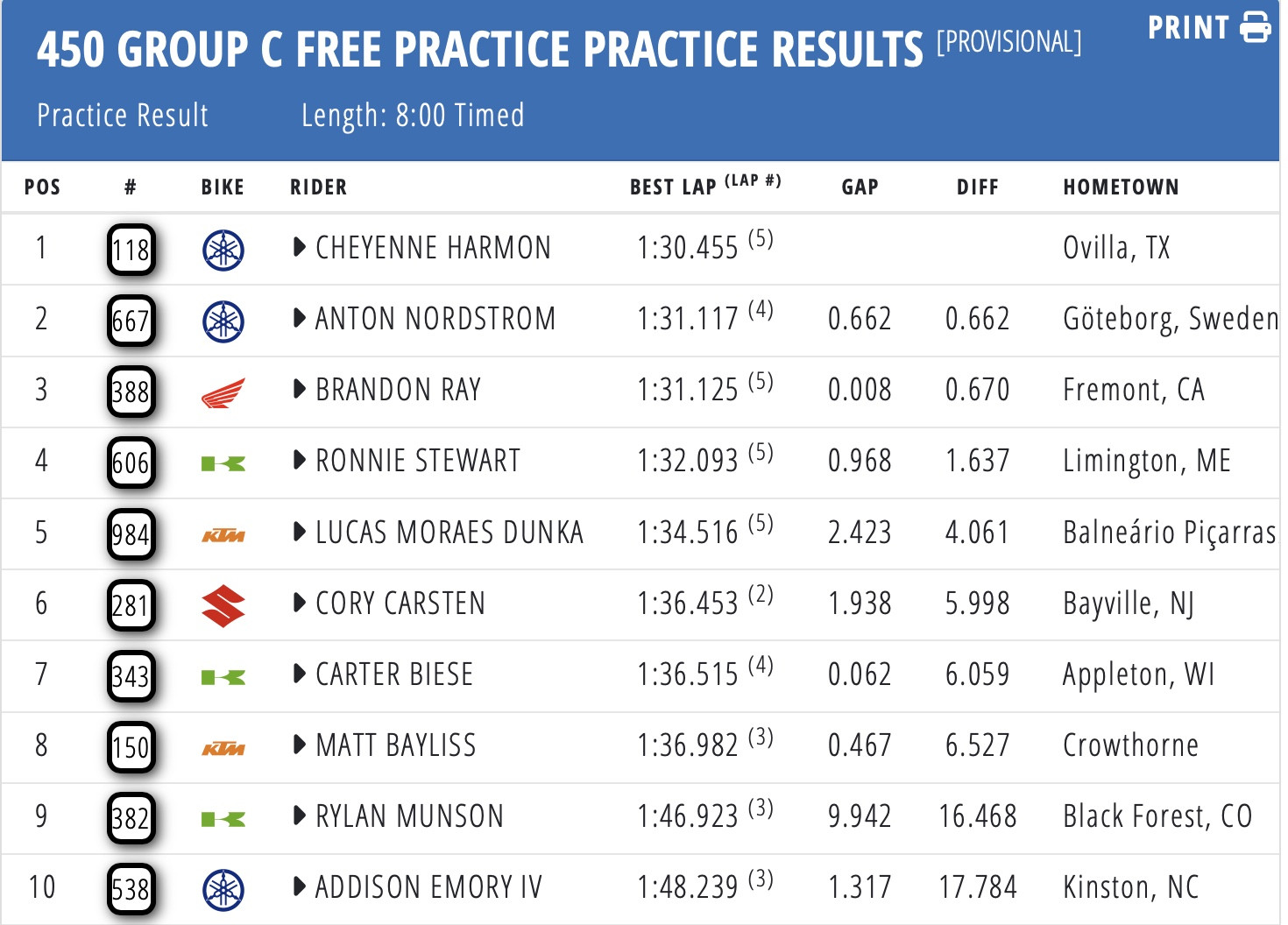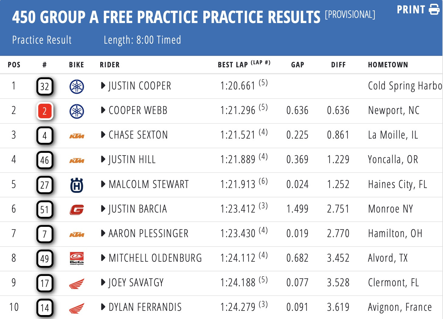 | 4 | Justin Cooper | 0.368 | 1:19.592 | Cold Spring Harbor, NY | Yamaha YZ450F | |