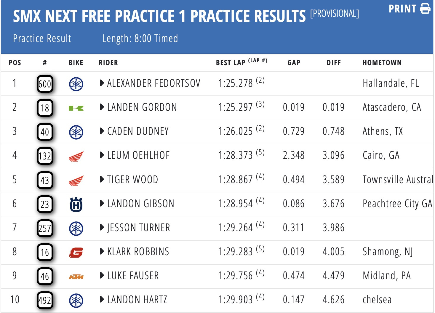In the first practice for Next, Florida rider Alexander Fedortsov set the fastest time with a 1:25. 278, with Landen Gordon close behind with a 1:25.297.
