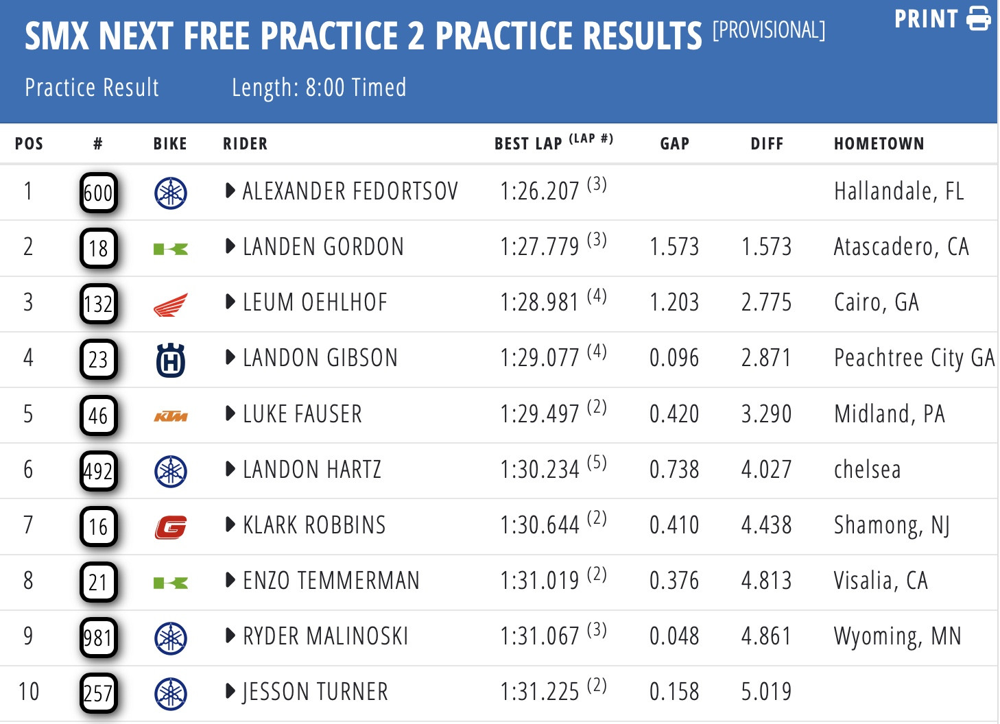 In the second Next practice disaster hit right away when Liam Oehlhof who was doing a different rhythm than Caden Dudney, clipped Dudney upon landing. Dudney who was third fastest in the first practice got up and walked off but did not go back out on his bike. Meanwhile, Florida boy Alexander Fedortsov once again topped the board with a 1:26:207
