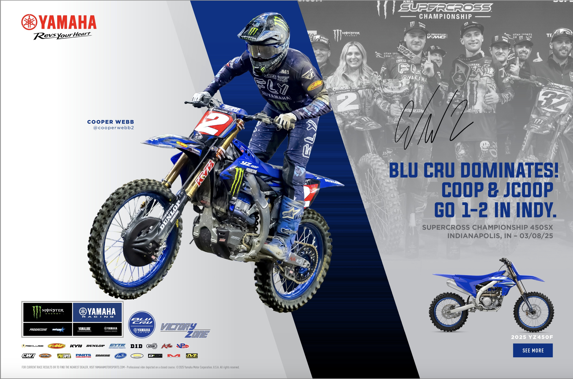 As far as Indianapolis goes, I don’t have much to add—I was in Charlotte watching it on my phone. Needless to say, North Carolina’s own Cooper Webb was fully in control, winning for the third time in the last four rounds. The former two-time 450SX Champion now has a 15-point lead over Red Bull KTM’s Chase Sexton and 26 over third-ranked Ken Roczen, who started near dead last after getting caught up with Jason Anderson in the first turn. And congrats to Justin Cooper, Webb’s Monster Energy Yamaha Star Racing teammate, on tying his career-best runner-up finish. This Cooper is now fourth in the standings and a solid top-five presence over the last month.