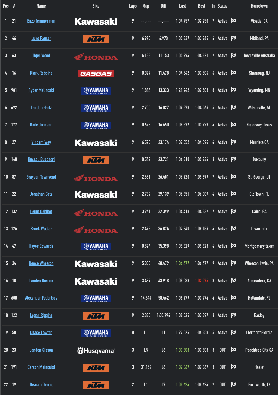 | 5 | Crockett Myers | 1:05.690 | Navasota, TX | KTM 250 SX-F |