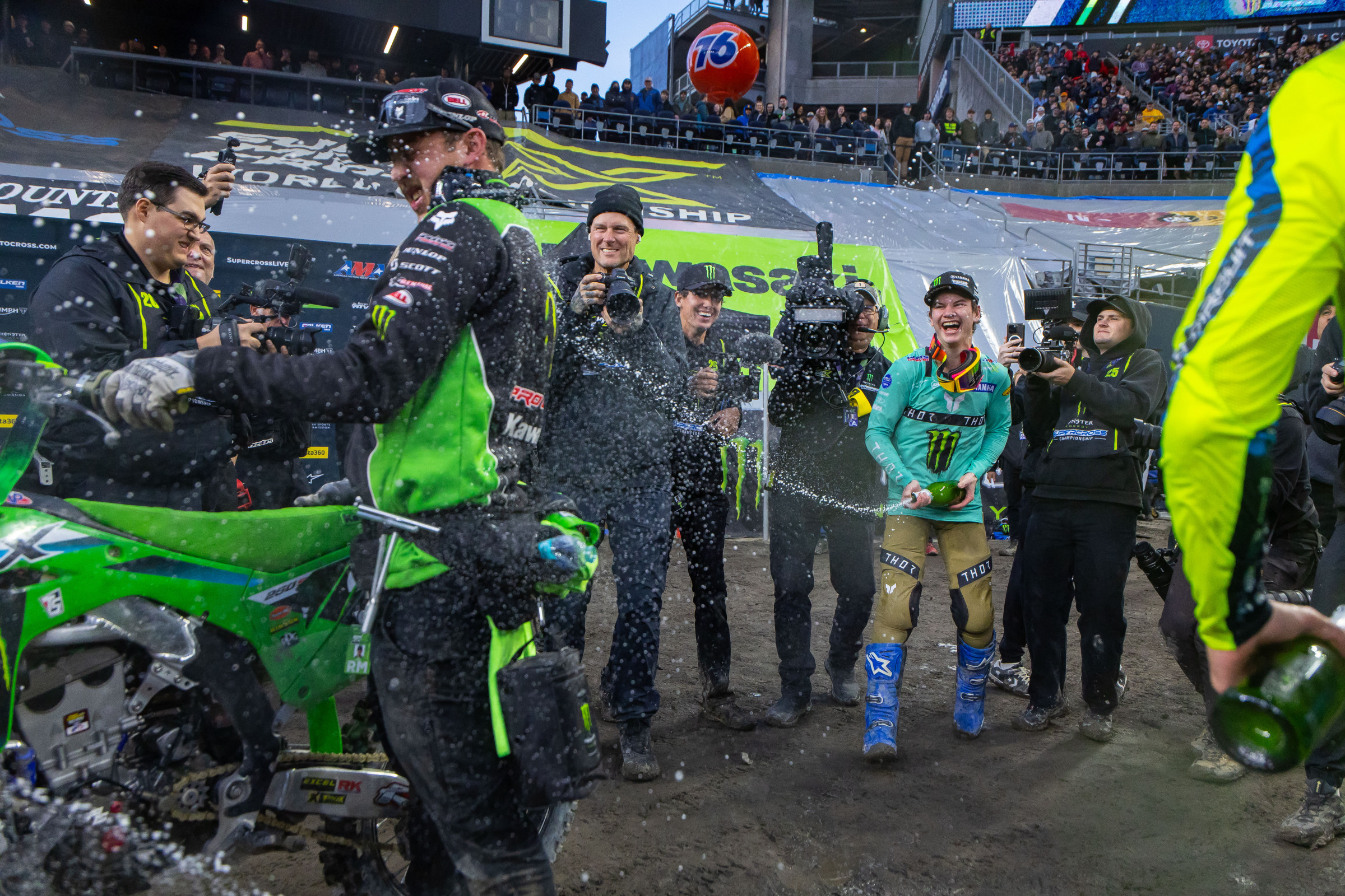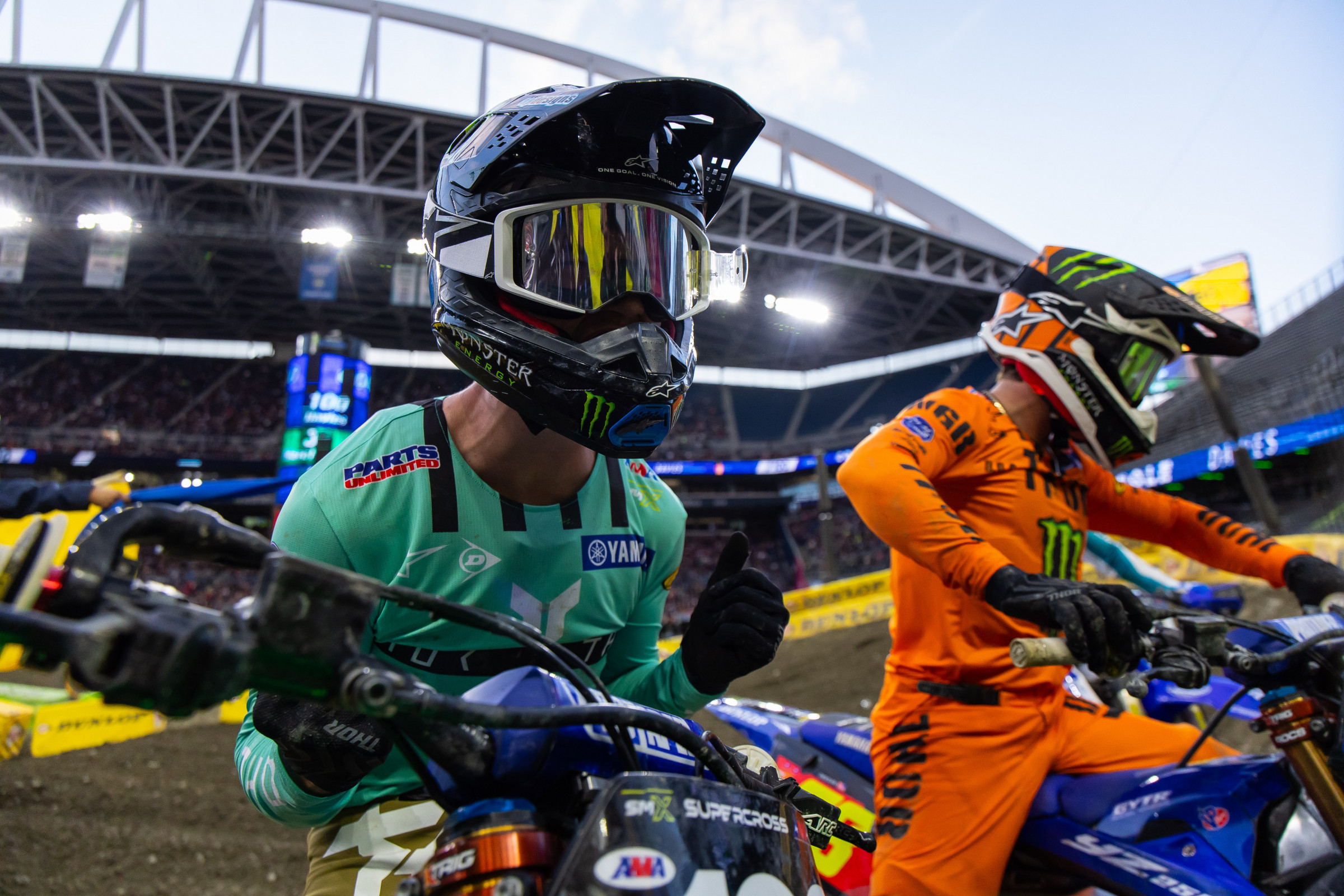 And from his first pro race at Anaheim in January, the #100 has in fact looked ready to race in the pro ranks. In Seattle, he was 11th in qualifying but made some changes after his heat race win, besting Garrett Marchbanks, his teammate Haiden Deegan, and the rest of the field. He got the start in the main event and the changes paid off. For someone in just their seventh pro start—and seventh supercross main event—Davies was cool, calm, and collected during basically the entire main event at Lumen Field. The track was not a mudder like some expected it could be after a week filled with rain but the track was far from easy. Still, Davies navigated it to bring home the win.