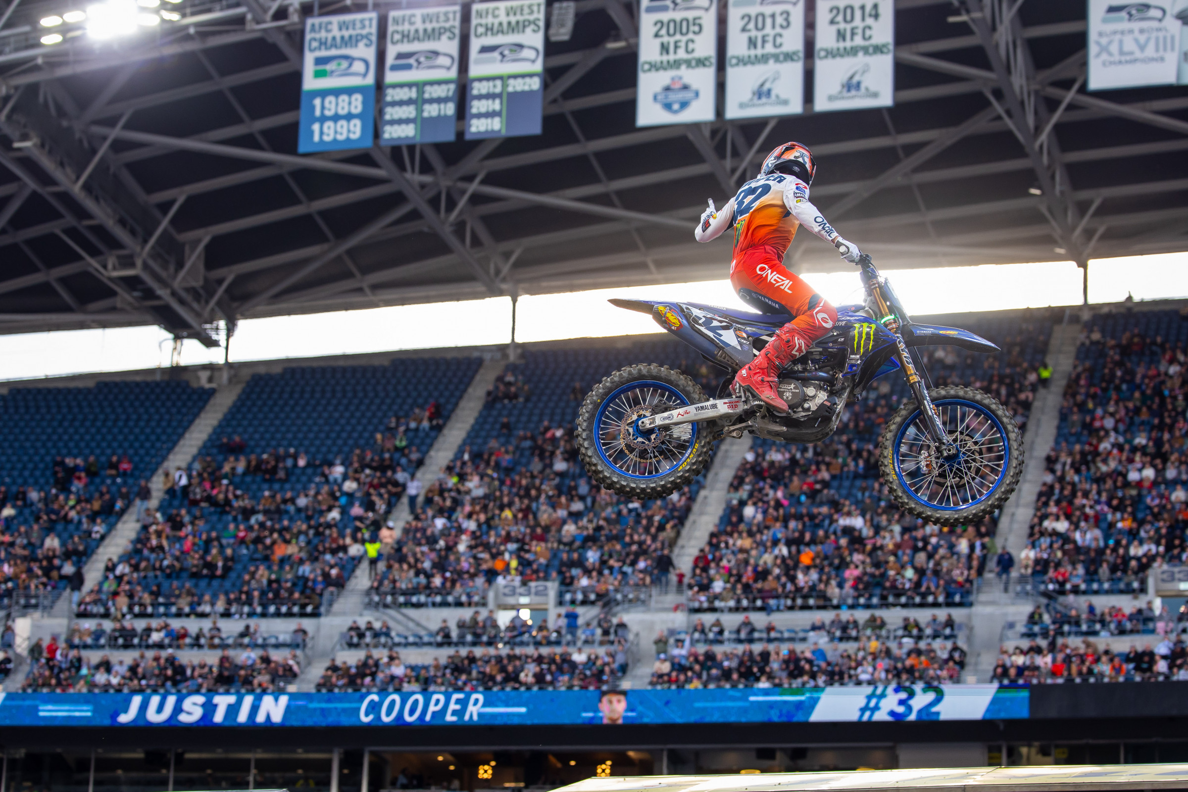 Monster Energy Yamaha Star Racing’s Justin Cooper continued his upward trajectory in Seattle. He qualified on the pole, and straight up caught and passed his teammate Cooper Webb to take the first 450 Heat Race win of his career. Cooper gave Webb a taste of his own medicine over the finish, pulling out a finger gun of his own! In the main, JCoop was in the lead battle with Roczen, Sexton, and Webb. He appeared to have a podium on lock until he got into the tough blocks in a rhythm lane and went down. Cooper ended up sixth on the night, but it may have been his best riding of the year thus far. He is on the cusp of a win.