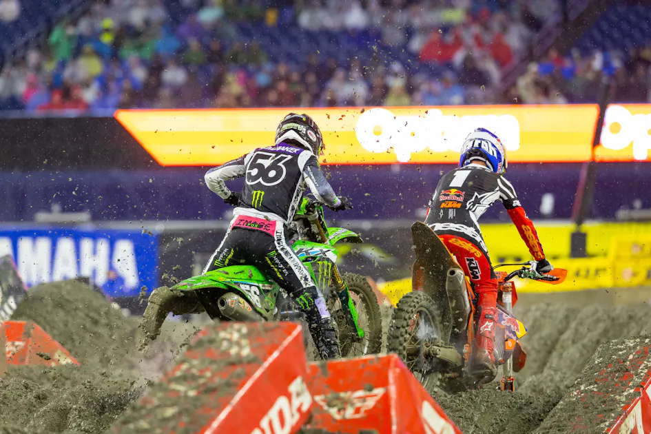 The 450SX Championship is now a 15-point advantage for Cooper Webb (third in Foxborough) over Chase Sexton (sixth in Foxborough) in what has been the back-and-forth battle between the two. But the 250SX East Division Championship had quite a shakeup in the Massachusetts mud.