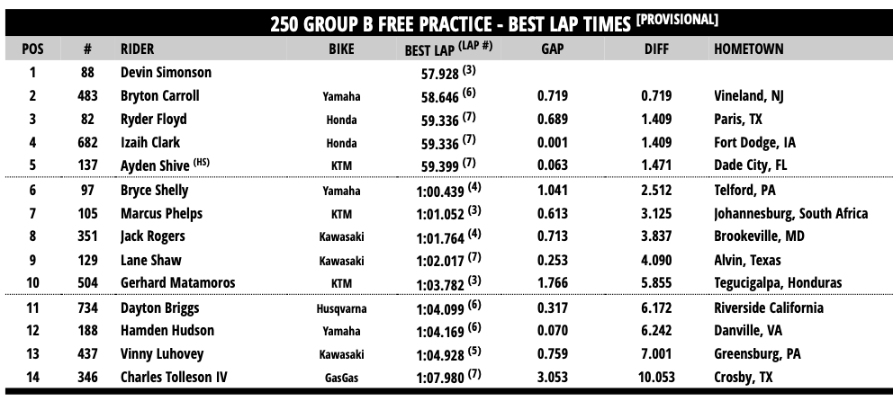 Gage Stine (250SX group C) and Devin Simonson (250SX group B) topped their respective free practice sessions. Simonson is making his return to racing today after a pre-season wrist injury kept him out until now. Chance Hymas (54.555) topped the 250SX group A free practice session over Seth Hammaker (54.860), Nate Thrasher (56.259), and Maximus Vohland (56.336). These times do not count for overall qualifying.