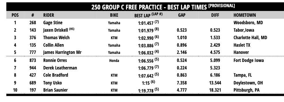 | 5 | Thomas Welch | 1:00.472 | Charlotte Hall, MD | KTM |