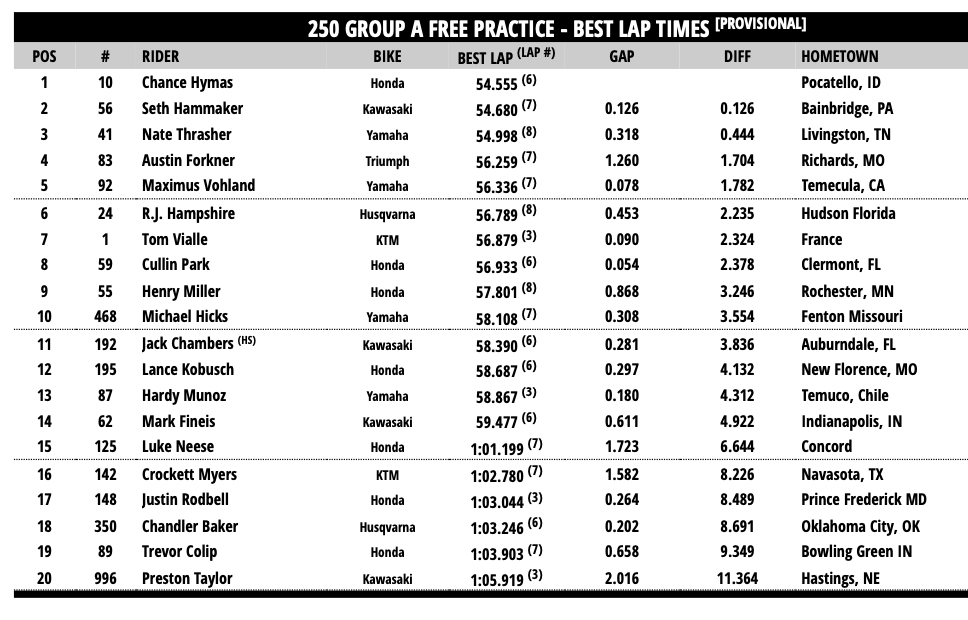 | 2 | R.J. Hampshire | 52.689 | Hudson, FL | Husqvarna FC 250 Rockstar Edition | ||