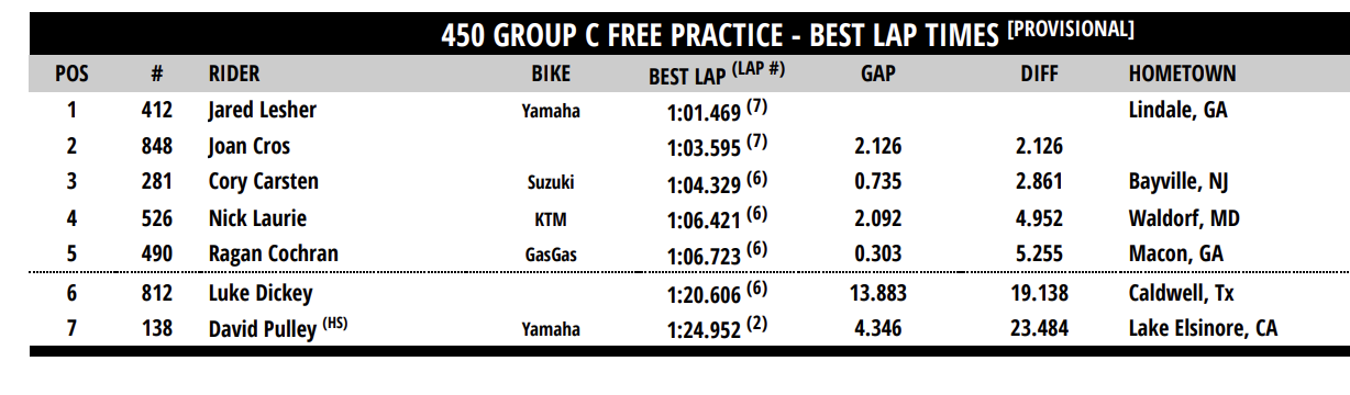 | 4 | Justin Cooper | 53.397 | Cold Spring Harbor, NY | Yamaha YZ450F | ||