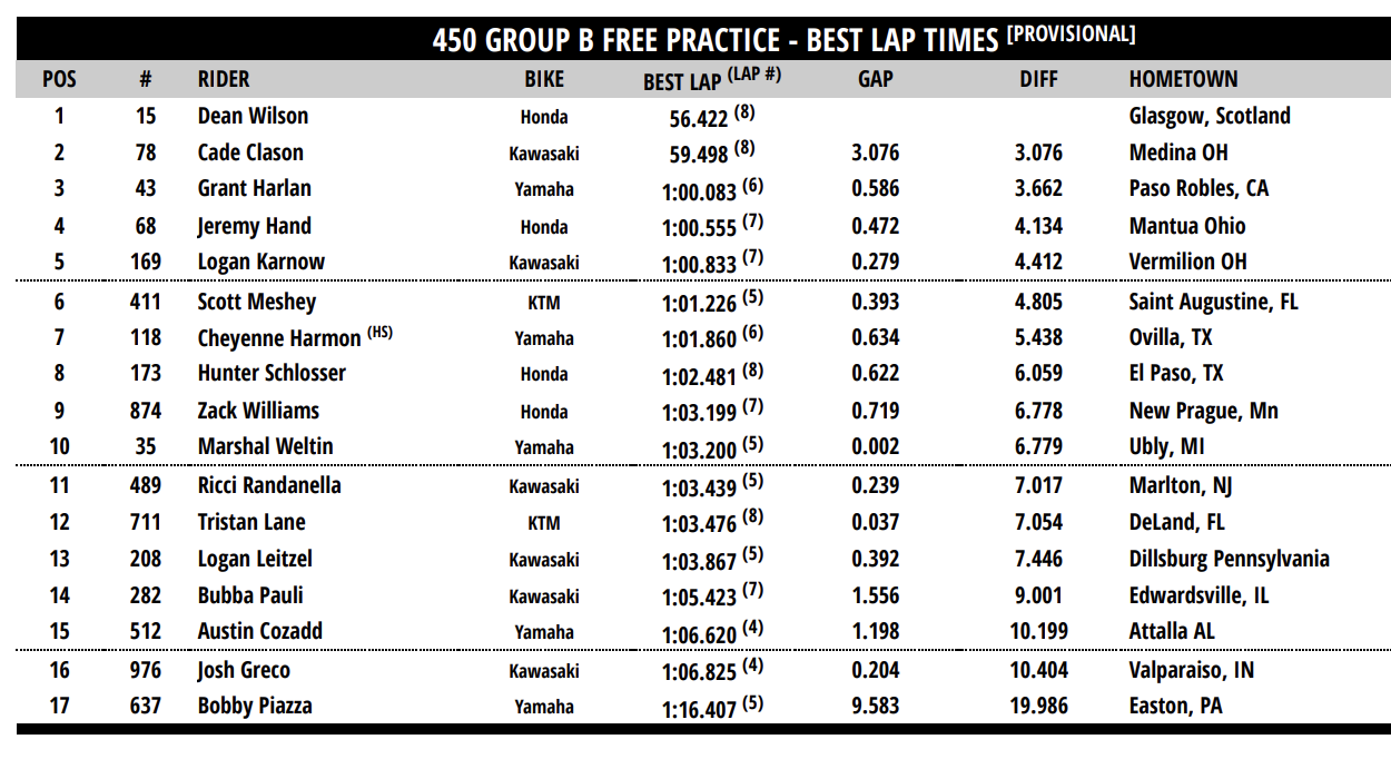 Dean Wilson (450SX group B) and Jared Lesher (450SX group C) topped their respective sessions.