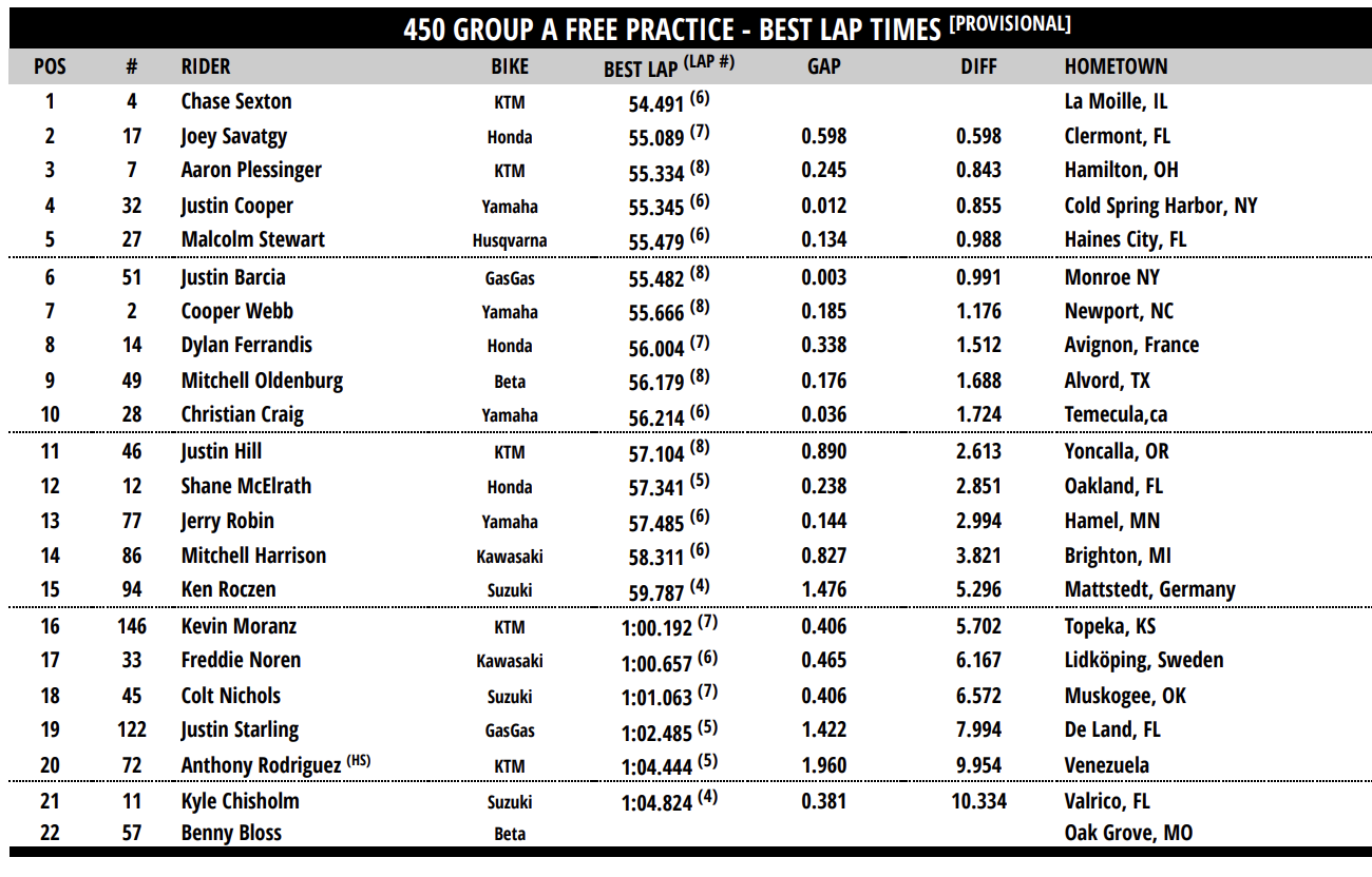 | 1 | Chase Sexton | 51.254 | La Moille, IL | KTM 450 SX-F Factory Edition | ||