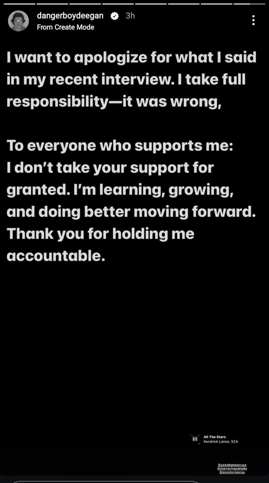 Deegan took to his Instagram story to apologize for his interview, not the pass on Davies, saying: